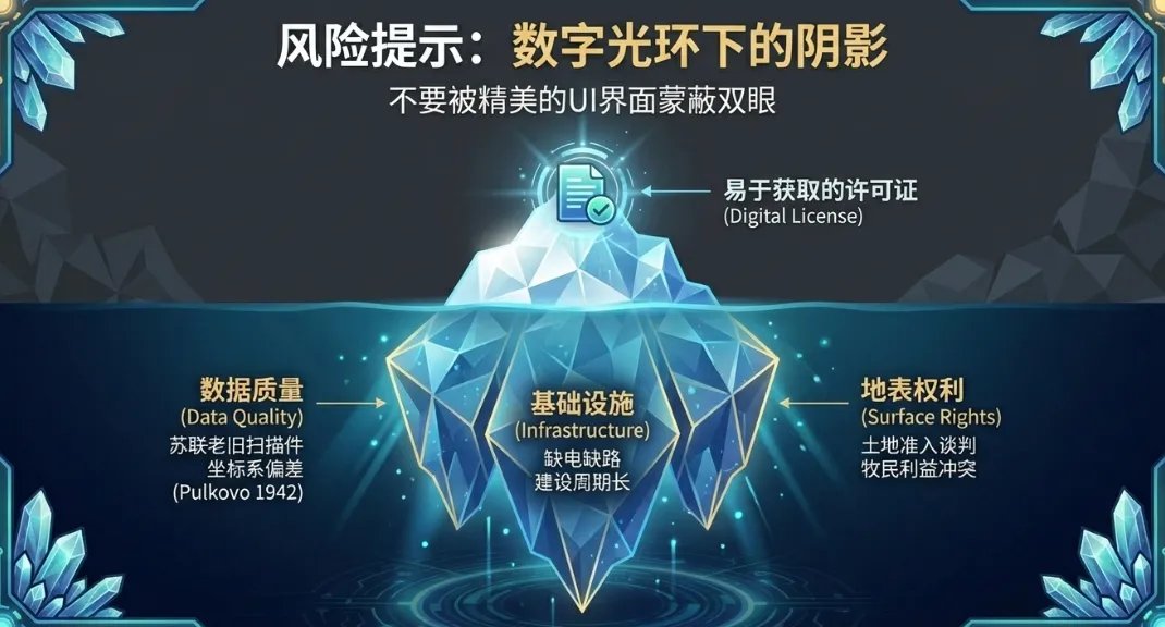 地缘影响:通过采用 CRIRSCO 标准和全英文界面的平台,哈萨克斯坦实际上是在向西方矿业资本“投名状”。这使得该国迅速成为欧盟“关键原材料俱乐部”的核心候选成员。7. 挑战与风险提示:数字光环下的阴影