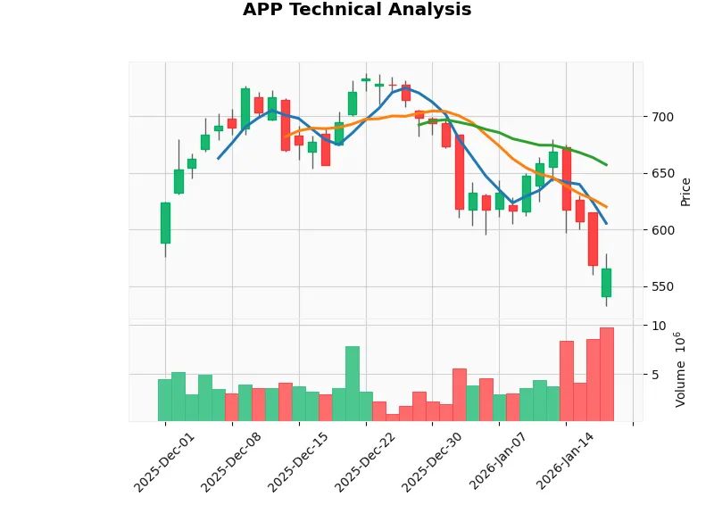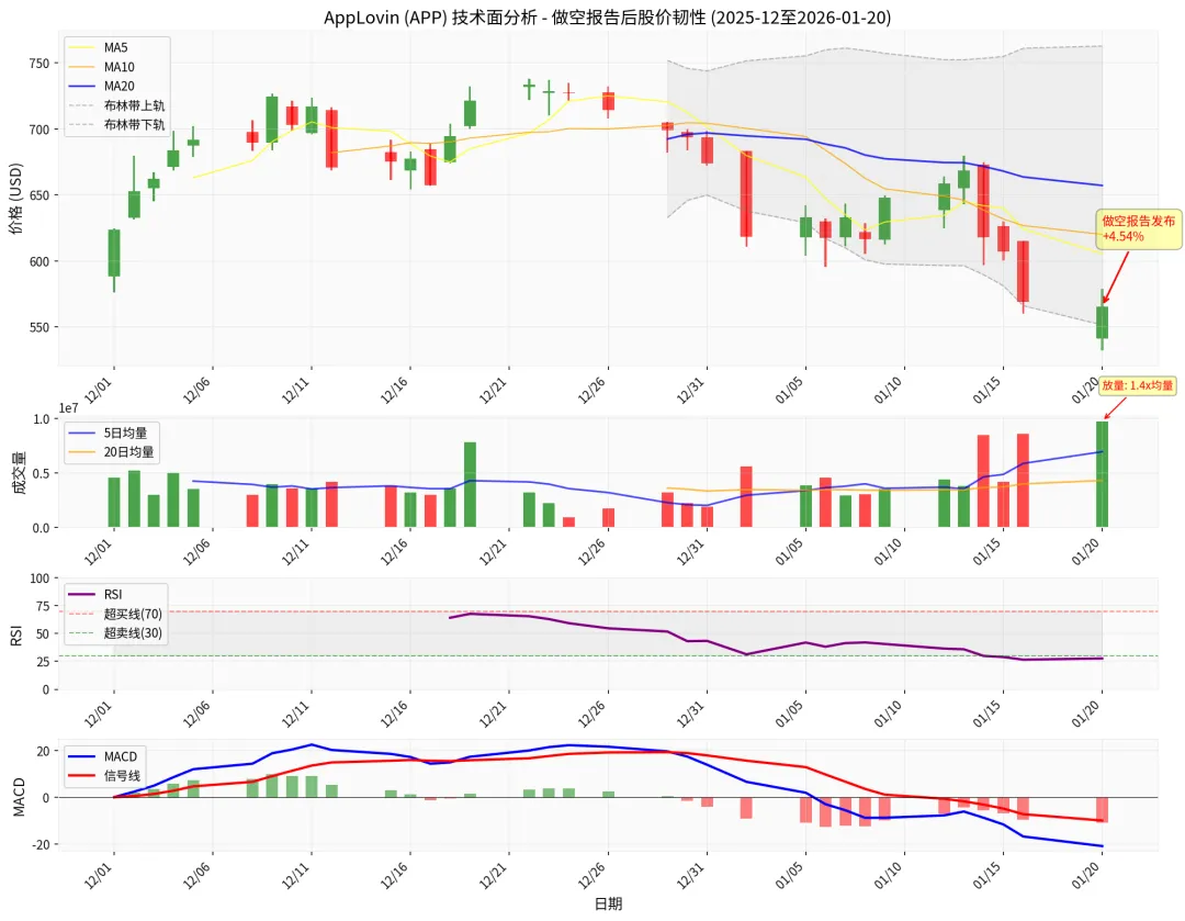 做空报告日(1月20日)出现强劲反弹:从$540.96开盘涨至$565.52收盘 RSI处于深度超卖区域:27.64的RSI值显示股价严重超卖 布林带位置接近下轨:当前价格位于布林带6.6%位置 MACD下跌动能衰竭:柱状图从最低-30+收窄至-2.48 成交量显著放大:报告日成交量达973.7万股