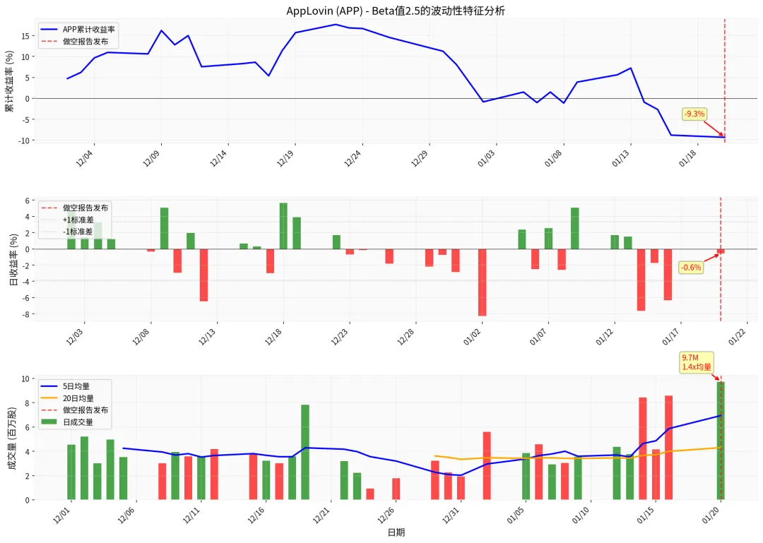 Beta值2.5(高Beta特性):AppLovin的波动性是纳斯达克指数的2.5倍 期间累计收益率-9.3%:主要下跌发生在1月14-16日(报告发布前) 报告日强劲反弹:1月20日实现+4.54%涨幅,显著强于大盘 日均波动率3.60%:高波动特征符合Beta 2.5的属性 成交量峰值:报告日成交量达到973.7万股,为期间最高