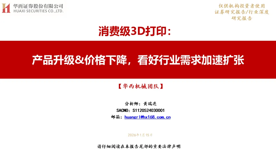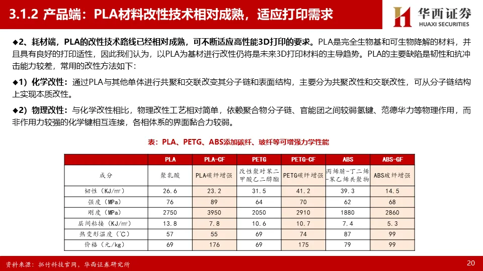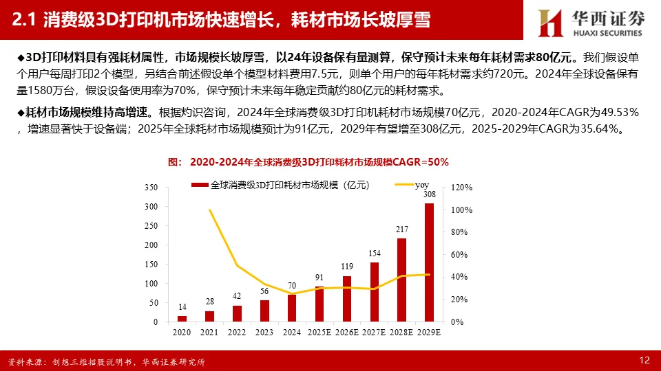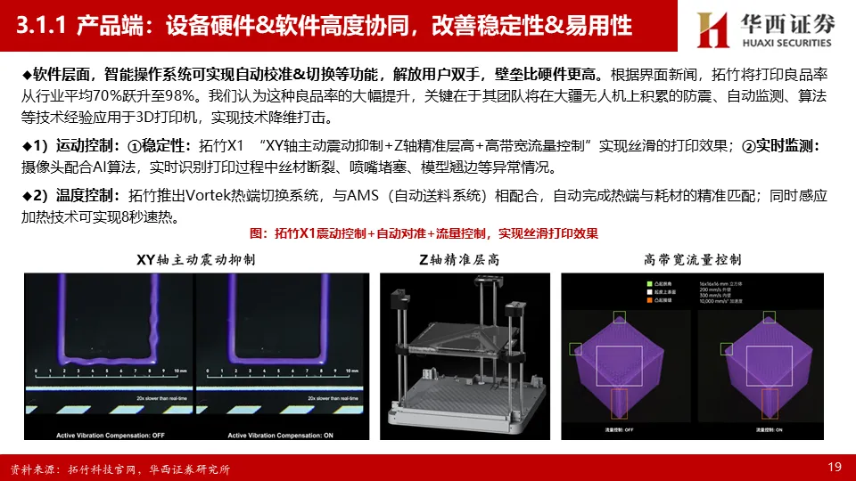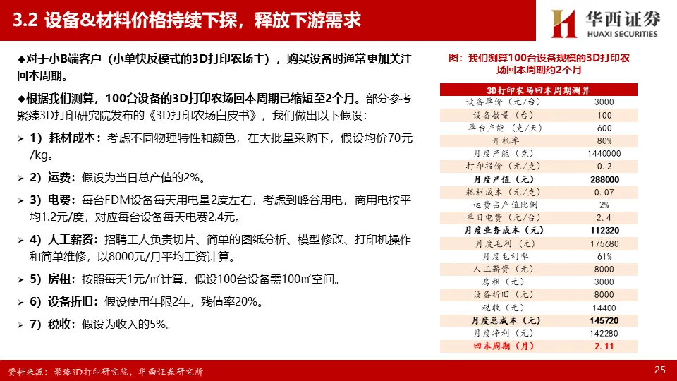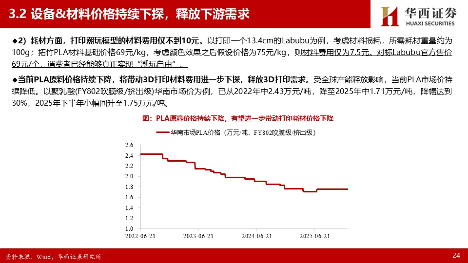 1)产品端:①设备:运动&温度控制是实现良好打印效果的关键,早期使用者需手动调节设备参数,如今主流机型已在硬件&软件层面形成高度协同,可自动监测并调整层纹明显、填充不完整、线材缠绕、喷嘴堵塞等问题,显著改善打印稳定性和易用性。②耗材:以PLA为基材进行改性仍将是未来3D打印材料的主导趋势,目前PLA的物理、化学等改性技术路线已经相对成熟。③建模:头部设备商自有云平台陆续接入腾讯混元等AI模型,极大释放普通用户潜力。2)价格端:对于C端客户,设备购置金额和材料费用均已下探至可接受心理价位;对于小B端客户,回本周期已缩短至2个月左右。3)同时,各设备厂商正积极投入3D打印生态建设,有望进一步催化行业需求增长。