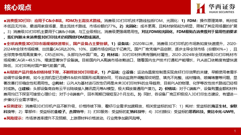 1、消费级3D打印:应用于C&小B端,FDM为主流技术路线。