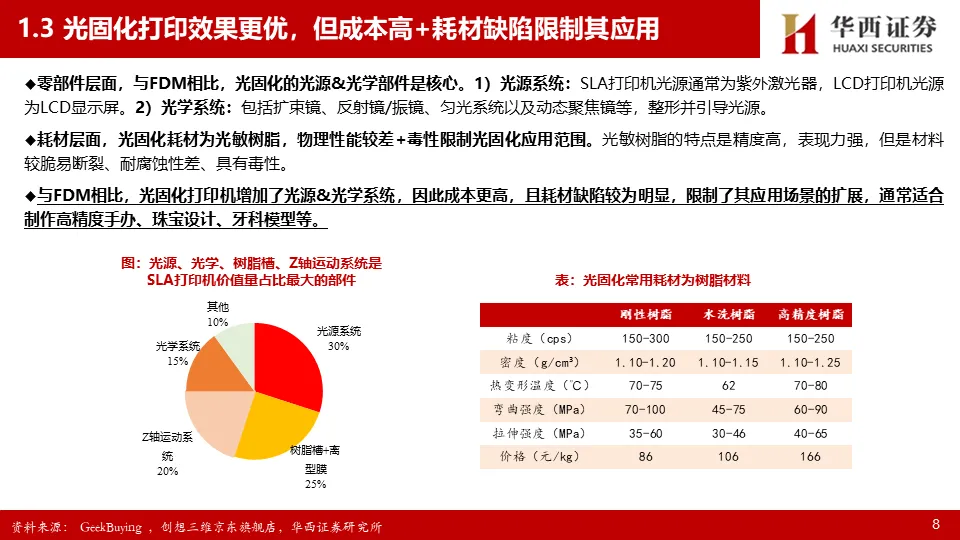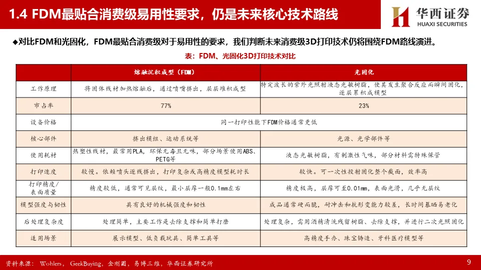 消费级3D打印机技术路线包括FDM、光固化:1)FDM:操作原理简单,耗材成本低且无污染,最适用家庭场景,是主流技术路线,市场份额约77%。2)光固化:成本更高,且耗材缺陷较为明显,限制了其应用场景的扩展。3)消费级3D打印机主要用于C端&小B端,与工业级相比,消费级更强调易用性。对比FDM和光固化,FDM最贴合消费级对于易用性的要求,我们判断未来消费级3D打印技术仍将围绕FDM路线演进。