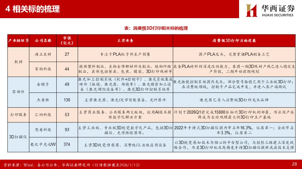 消费级3D打印机产品不断升级,价格持续下降,看好行业需求加速释放,相关受益标的如下:1)耗材:受益标的海正生材、家联科技等;2)零部件:受益标的金橙子、杰普特等;3)打印服务:受益标的汇纳科技等;4)3D扫描仪:受益标的思看科技、奥比中光-UW等。