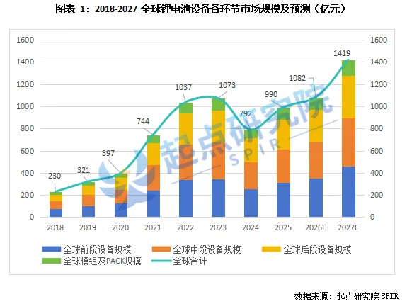 起点研究院SPIR预计到2027年全球锂电设备市场规模达1419亿元,其中前段设备市场规模为460亿元,中段设备市场规模为434亿元,后段设备市场规模为383亿元,模组及PACK市场规模为142亿元。
