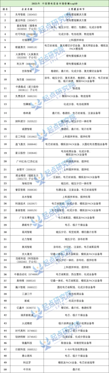2025全球锂电池设备市场规模中TOP30企业占比达65.7%;锂电设备领先企业包含先导智能、赢合科技、璞泰来,合计市场规模占比达24.6%。2025年度中国锂电池设备市场份额TOP1-TOP50企业为:先导智能、赢合科技、嘉拓智能(璞泰来子公司)、杭可科技、无锡理奇、联赢激光、大族锂电(大族激光子公司)、利元亨、吉阳智能、海目星、中鼎集成(诺力股份子公司)、先惠技术、恒翼能、格林晟、纳科诺尔、诚捷智能、宏工科技、逸飞激光、星云股份、广州红尚/江苏红运、金银河、超业精密(福能东方子公司)、海裕百特、誉辰智能、尚水智能、科瑞技术、豪森智能、广东东博智能、鼎能电子、易鸿智能、达力智能、奥鸿智能、光大激光、浩能科技(科恒股份子公司)、奥瑞特、中基自动化、奥特维、瀚川智能、工源三仟、新威、亿鑫丰、瑞昇新能源、大成精密、时代高科、铂纳特斯、钹鑫科技、日联科技、愚公高科、科迈罗以及中天和。
