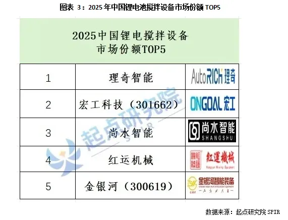 2025年度中国锂电搅拌设备市场份额TOP5企业为:理奇智能、宏工科技、尚水智能、红运机械、金银河。其中,理奇智能和尚水智能正在IPO过程中,尚水智能已经过会。理奇智能2022-2025年上半年,公司营收分别为6.19亿元、17.21亿元、21.73亿元、11.89亿元,归母净利润分别为1.07亿元、2.39亿元、2.70亿元、1.50亿元,理奇智能主要服务宁德时代、比亚迪、LG新能源等头部客户。尚水智能2022-2025年上半年,公司营业收入分别为3.97亿元、6亿元、6.37亿元和3.98亿元。尚水智能2025上半年前五大客户为亿纬锂能,比亚迪、中汽新能、瑞浦兰钧和品鑫能源。红运机械则是老牌的锂电池搅拌设备企业,广州红运机械(广州红尚机械)创建于1993年,是国内最早致力于混合设备的研发、制造及销售于一体的现代化企业。公司现有员工近500人,拥有广州、常州两大现代化生产基地,具备年产1500台套的能力,是国内超一流的“混合设备及系统集成”的综合服务提供商。