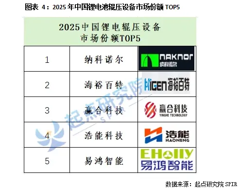 2025年度中国锂电辊压设备市场份额TOP5企业为:纳科诺尔、海裕百特、赢合科技、浩能科技以及易鸿智能。