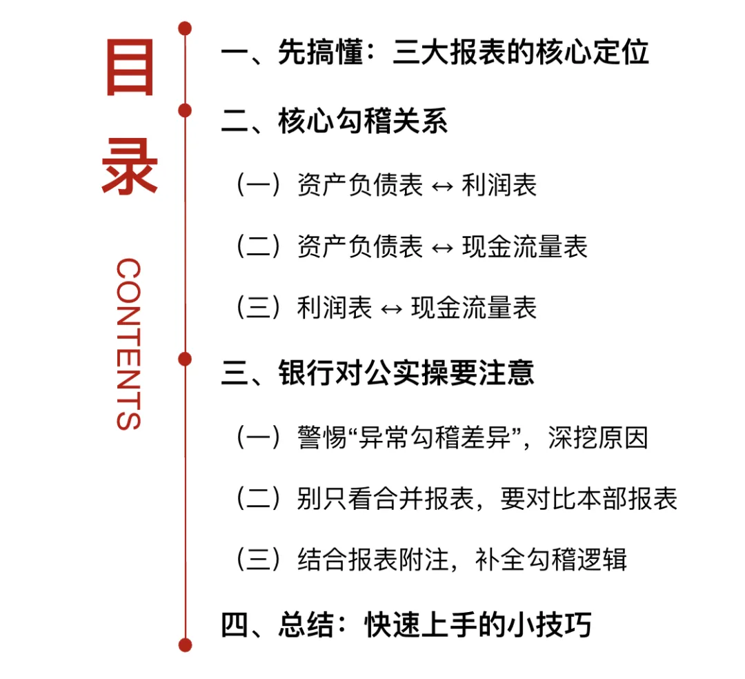 实操提示:做对公授信,最关心企业的“造血能力”和资金链安全,这组勾稽关系直接反映企业现金的真实性。比如企业说现金流很好,但资产负债表的货币资金没增长,大概率是现金流表有水分。