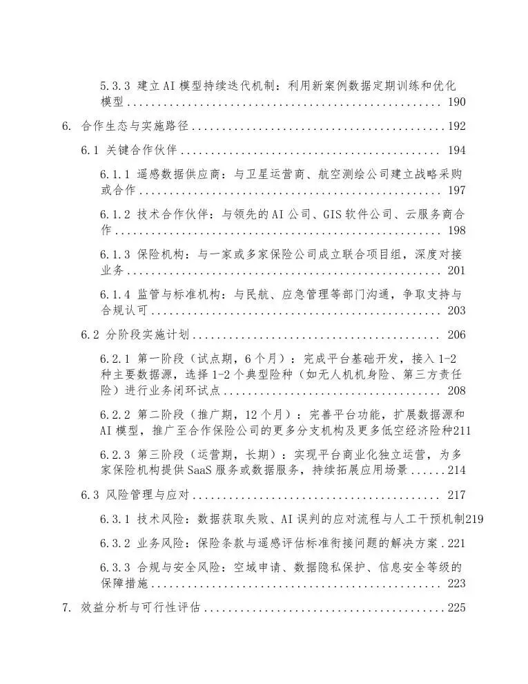 本方案严格遵循现有技术标准与法规框架,所有采用的技术手段均已具备商业化服务能力,数据获取渠道成熟可靠,分析流程设计兼顾了自动化效率与人工审核的可靠性,确保能够快速部署并融入保险公司现有的承保、理赔与风控业务流程,为低空经济的安全、可持续发展提供坚实的风险管理基础设施。