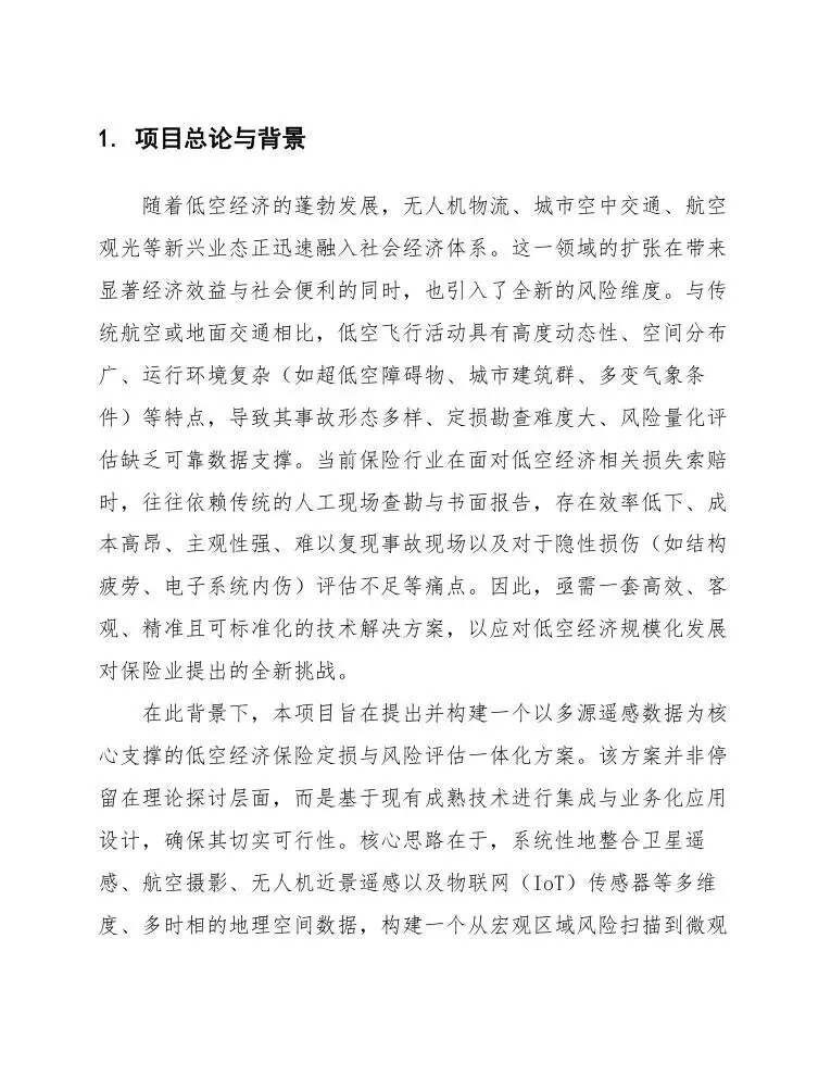 在此背景下,本项目旨在提出并构建一个以多源遥感数据为核心支撑的低空经济保险定损与风险评估一体化方案。该方案并非停留在理论探讨层面,而是基于现有成熟技术进行集成与业务化应用设计,确保其切实可行性。核心思路在于,系统性地整合卫星遥感、航空摄影、无人机近景遥感以及物联网(IoT)传感器等多维度、多时相的地理空间数据,构建一个从宏观区域风险扫描到微观个体精准定损的全链条数据赋能体系。通过这一体系,保险公司能够实现从承保前的风险量化评估与定价,到出险后的快速响应、客观定损与理赔决策支持,最终达到降低运营成本、提升客户满意度、控制赔付率并开发创新保险产品的商业目标。