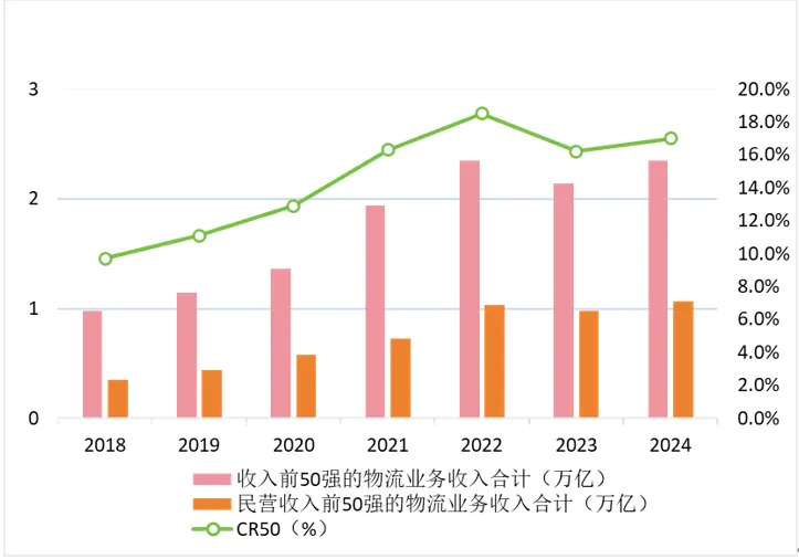 一是头部企业保持规模增长,市场集中度稳中有升。2024年,重点企业收入前50的物流企业物流业务收入合计2.35万亿元,占物流业总收入的比重17%,门槛比上年提高13.1亿元,市场集中度稳步提高。收入前50的物流企业中,千亿级企业5家,近三年占比持平。百亿级企业39家,占比提高10%,其中新上榜百亿级企业5家,从上年十亿级晋升百亿级6家,呈现出龙头企业规模稳定、中间企业提质扩容的良好态势。重点民营企业收入前50的物流业务收入合计1.07万亿元,门槛比上年提高0.1亿元。