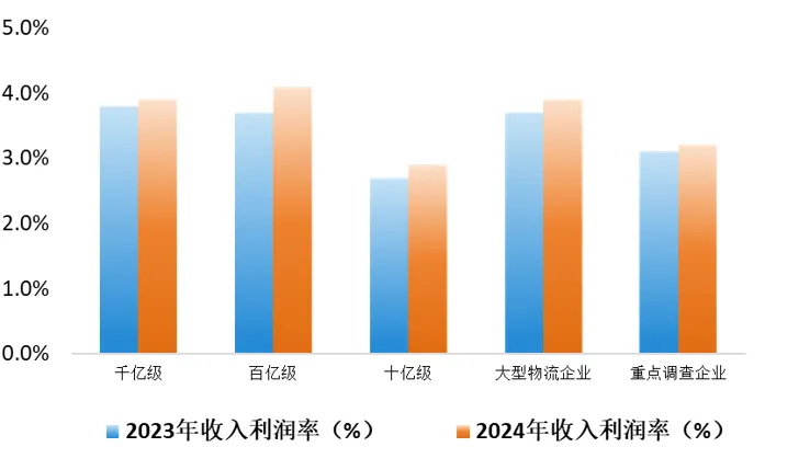 四是盈利水平小幅提升,经营效益逐步改善。大型物流企业收入利润率3.9%,比上年增长0.2个百分点,高于重点调查平均水平0.7个百分点。多数大型物流企业保持韧性经营,通过数智化升级和供应链降本推动业务增收盈利。分企业规模看,千亿级和百亿级企业利润率均在4%左右,反映头部企业经营优势有所显现,对物流整体效益改善具有一定的引领带动作用。从服务类型看,水运、快递行业需求规模向好,企业自身配套能力建设完善,利润相对较高,达到4.8%和4%左右。传统公路运输以及综合供应链发展还需要持续不断优化,利润率处在较低位。