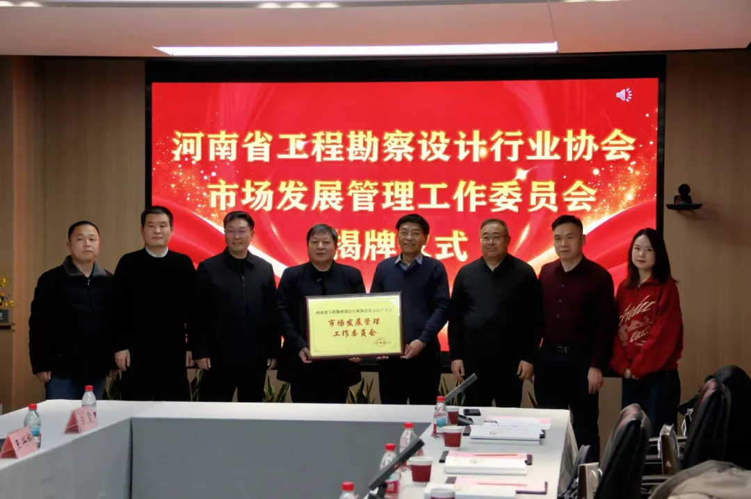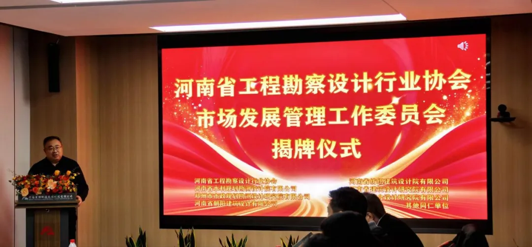 1月19日下午,河南省工程勘察设计行业协会市场发展管理工作委员会揭牌仪式在我司隆重举行。河南省工程勘察设计行业协会张守礼会长亲临现场指导,杜朝华副会长、冯光伟副会长等协会领导到会支持。河南省建筑设计研究院有限公司董事长、协会常务理事郑彦凯及郑州市市政规划勘测设计研究院有限公司市场发展部副部长张晓旺作为副主任委员单位代表出席,与各会员单位代表、行业同仁齐聚一堂,共同见证这一重要时刻。