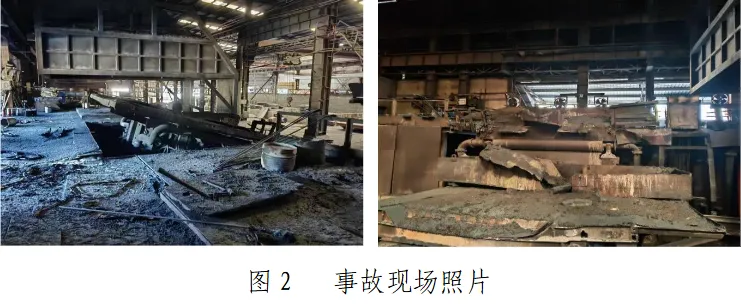 经现场勘查,本次事故发生在5号车间中频炉熔炼区域,现场1跨北侧从东到西依次摆放2台20T中频炉、1台25T真空脱气炉、烤包区、造型区和模具库,南侧布置铁水转运线和浇铸区,事故发生钢水喷溅为2号20T中频炉。