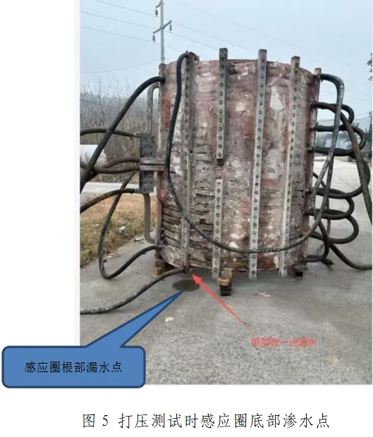 中频炉感应圈分析炉衬打结完成后准备通电烘炉,筑炉工肖某升发现感应圈与水冷电缆连接处有渗水现象,但炉长童某玉未采纳筑炉工肖某升意见及时处理,随即通电烘炉,导致渗漏的水进入炉底耐火材料,使炉底耐火材料受潮,烘烤5小时18分后停炉约5小时,此时感应圈持续渗水,继续使炉底烘干的耐火料受潮。事发后对2号炉感应圈通水打压测试,发现感应圈底部有渗水点。