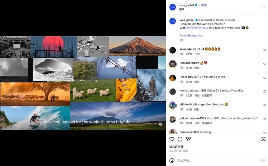 vivo將產品功能與大眾對美好生活的嚮往相結合,打造高質量傳播內容。2025年12月16日,vivo在照片牆(Instagram)賬號發布一則由精美圖片剪輯而成的視頻帖文,配文寫道:「一瞬、一幀、一景,準備好加入創作者的世界了嗎?讓我們用#vivoVISIONplus 再拍一張吧。」截至統計日,該視頻觀看量突破717萬次,收穫35.5萬次點贊,實現品牌傳播與用戶互動的雙贏。