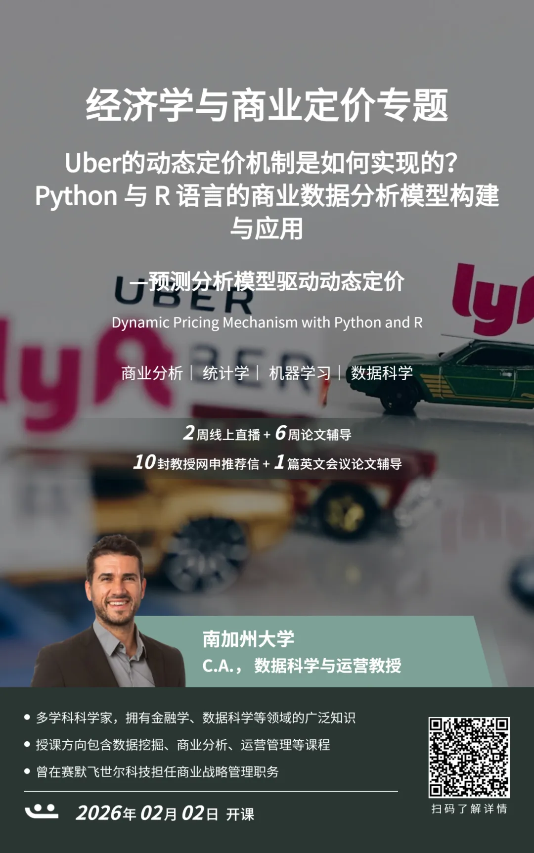 今日推荐课题《经济学与商业定价专题 | Uber 的动态定价机制是如何实现的?Python 与 R 语言的商业数据分析模型构建与应用》,为学生提供必要的知识和技能,使其能够在动态竞争的商业环境中有效分析复杂的商业数据、制定数据驱动的策略并做出明智决策。