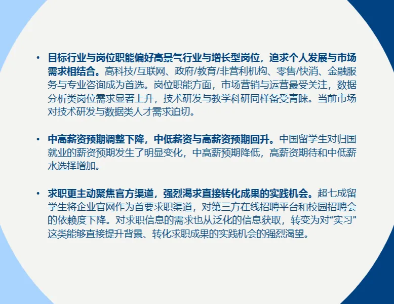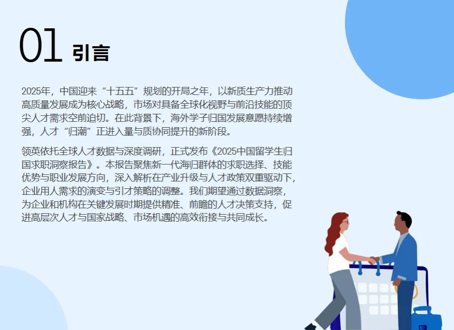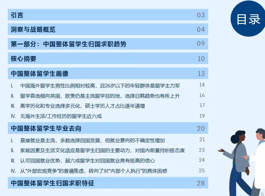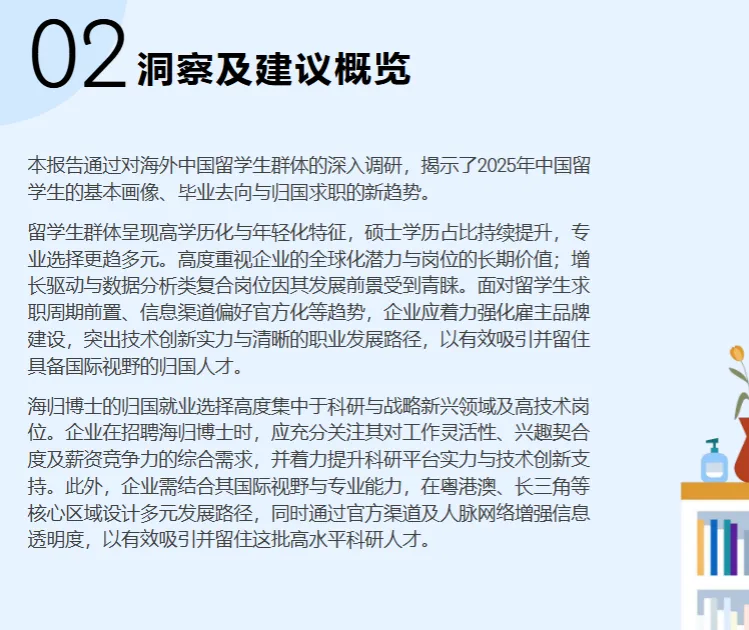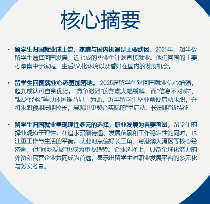领英《2025 中国留学生归国求职洞察报告》核心结论:留学生归国发展意愿持续增强,超半数选择回国就业,求职心态更趋务实,聚焦高薪与稳定平衡,偏好核心经济圈与家乡双向选择,高科技、公共部门成热门赛道,博士群体高薪资预期显著,信息对称与职业适配成求职核心诉求。