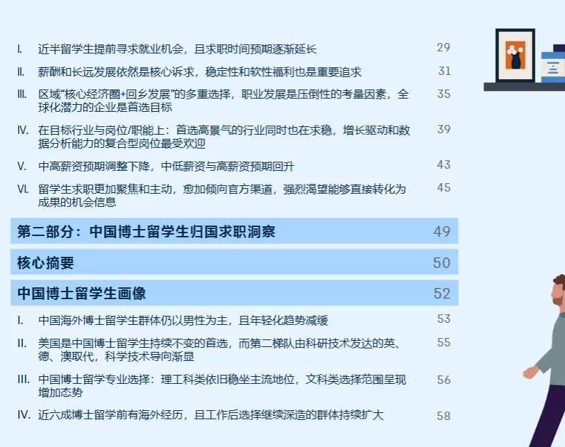 求职准备:45% 提前在海外启动求职,预期周期延长,3 个月左右成主流时间预期。 择业考量:薪资福利、职业发展前景为核心诉求,工作稳定性、工作生活平衡权重上升。 区域选择:长三角(35%)、粤港澳大湾区(20%)为首选,21% 选择回乡发展,兼顾机会与生活成本。 企业偏好:外资企业(44%)仍受青睐,全球化民营企业吸引力提升,学术机构成博士群体首选。