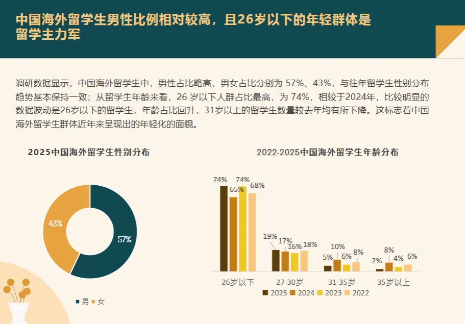 性别与年龄:男性占比 57%,26 岁以下年轻群体占 74%,留学群体持续年轻化。 留学目的地:欧美仍是主流,英国、美国稳居前二,日韩、港澳等地区选择趋势上升。 学历与专业:硕士学历占比 59%,高学历化明显;商科、理工科为热门专业,专业选择更趋多元。 海外经历:58% 无海外工作 / 生活经历,“象牙塔直升” 型留学生可塑性强。
