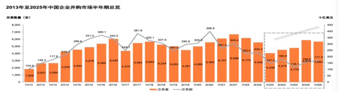 从2025年8月普华永道《中国企业并购市场2025年中回顾及展望》来看,2015年版《指引》出台后,我国企业并购市场经历了明显的增长,2016年并购交易额最高达到7091亿美元,2021年并购数量达到峰值12862宗。自2021年至2025年,交易额和交易数量都呈现明显下降趋势。