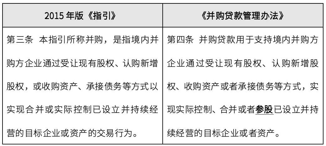 当前我国经济正处于新旧动能转换的关键时期。一方面传统产业逐渐进入整合优化期,另一方面新兴产业仍在培育壮大过程中。除控制型并购外,市场主体通过参股投资实现行业整合、转型升级的需求显著提升。拓宽并购贷款适用范围,既有利于助力传统产业升级改造,又有利于加快塑造经济发展新动能、新优势,提升金融服务实体经济质效。8在2015年版《指引》适用的控制型并购交易基础上,《并购贷款管理办法》进一步允许并购贷款支持满足一定条件的参股型并购交易。《并购贷款管理办法》在第四条中将参股型并购贷款解释为“支持单一并购方用于参股目标企业,但未实现对目标企业控制的贷款。”相较于2015年版《指引》第三条“实现合并或实际控制”的描述,《并购贷款管理办法》创新性地将仅参股而未实现控股的并购情形纳入可申请并购贷款的业务范围,扩大了资金支持的覆盖面。