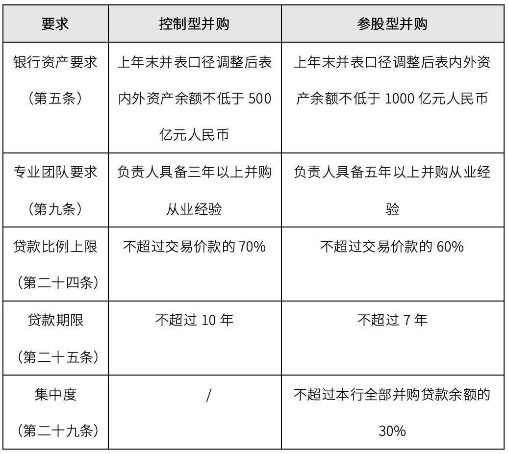 对开展控制型和参股型并购贷款业务的商业银行,《并购贷款管理办法》针对两类不同的业务对银行资质和审慎监管指标设置了差异化的要求。一方面,《并购贷款管理办法》对开展参股型并购贷款业务的银行资产和团队资质作出更高要求的规定,将上年末并表口径调整后表内外资产余额的最低要求从基础的500亿元人民币提高到了1000亿元人民币、专业团队负责人的从业经验从基础的三年以上提升到了五年以上。另一方面,《并购贷款管理办法》对参股型并购贷款的监管标准予以了更严格的标准,贷款占交易金额比例上限限制在60%、贷款期限限制为7年,且参与性并购贷款总额不得超过本行全部并购贷款余额的30%。