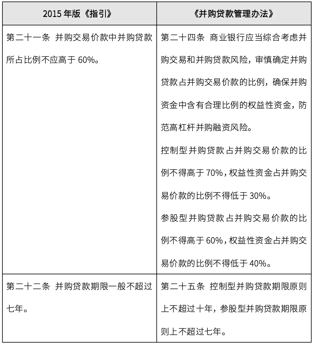 2015年12月10日,为贯彻落实《国务院关于进一步优化企业兼并重组市场环境的意见》,原银监会对84号文进行了较大幅度的修改,印发了《商业银行并购贷款风险管理指引》(银监发〔2015〕5号,以下简称2015年版《指引》)。2015年版《指引》对2008年版《指引》在并购贷款的适用范围予以扩大,并放宽了并购贷款限制性条件。具体而言,其一,不再对商业银行发放的并购贷款采取审批制;其二,将贷款期限由原来的5年改为7年;其三,并购价款的比例从50%上调至60%;其四,担保的要求由强制性改为原则性,删除了担保条件高于其他种类贷款的要求。