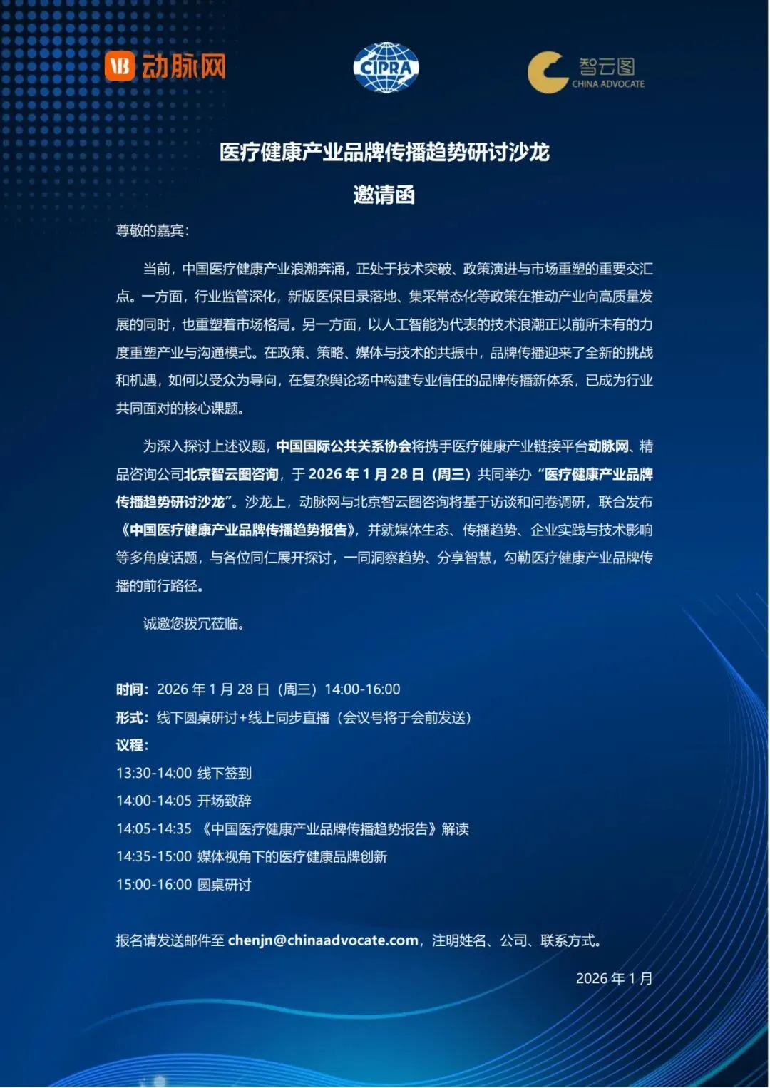 当前,中国医疗健康产业浪潮奔涌,正处于技术突破、政策演进与市场重塑的重要交汇点。政策深化与技术变革正重塑医疗健康产业格局,品牌传播迎来新挑战。2026年1月28日(周三),中国国际公共关系协会将联合动脉网、北京智云图咨询发布《中国医疗健康产业品牌传播趋势报告》,并就媒体生态、传播趋势、企业实践与技术影响等多角度话题,与各位同仁展开探讨,一同洞察趋势、分享智慧,勾勒医疗健康产业品牌传播的前行路径。
