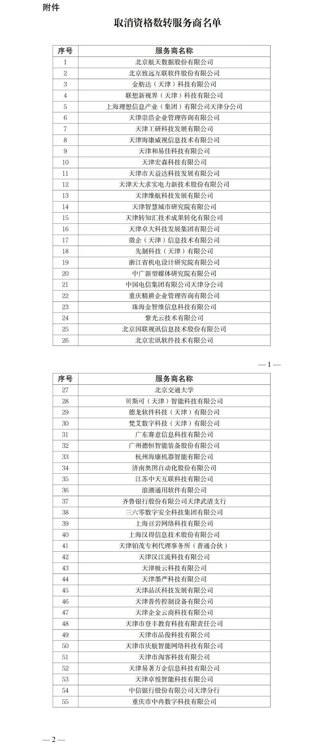 为规范武清区中小企业数字化转型城市试点数字化转型服务商(以下简称“数转服务商”)管理,提高数字化转型城市试点工作质效,根据《武清区中小企业数字化转型城市试点数字化转型服务商管理办法(2025年12月31日修订版)》《关于开展数字化转型服务商资源池动态管理工作的通知》对服务商动态管理的要求,区工业和信息化局取消55家武清区中小企业数字化转型城市试点数转服务商资格,详见附件。