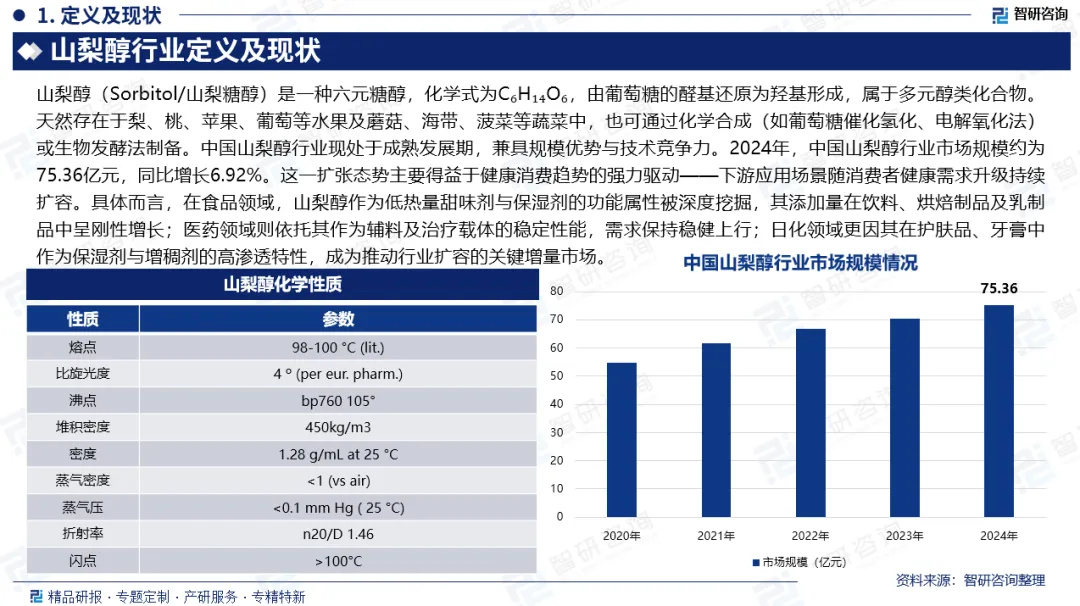 市场规模:中国山梨醇行业现处于成熟发展期,兼具规模优势与技术竞争力。2024年,中国山梨醇行业市场规模约为75.36亿元,同比增长6.92%。这一扩张态势主要得益于健康消费趋势的强力驱动——下游应用场景随消费者健康需求升级持续扩容。具体而言,在食品领域,山梨醇作为低热量甜味剂与保湿剂的功能属性被深度挖掘,其添加量在饮料、烘焙制品及乳制品中呈刚性增长;医药领域则依托其作为辅料及治疗载体的稳定性能,需求保持稳健上行;日化领域更因其在护肤品、牙膏中作为保湿剂与增稠剂的高渗透特性,成为推动行业扩容的关键增量市场。