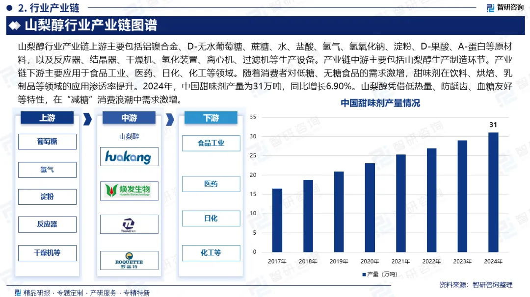 产业链核心节点:随着消费者对低糖、无糖食品的需求激增,甜味剂在饮料、烘焙、乳制品等领域的应用渗透率提升。2024年,中国甜味剂产量为31万吨,同比增长6.90%。山梨醇凭借低热量、防龋齿、血糖友好等特性,在“减糖”消费浪潮中需求激增。