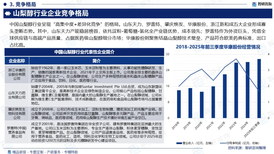 竞争情况:中国山梨醇行业呈现“高集中度+差异化竞争”的格局。山东天力、罗盖特、肇庆焕发、华康股份、浙江新和成五大企业形成寡头垄断态势。其中,山东天力产能稳居榜首,依托淀粉-葡萄糖-氢化全产业链优势,成本领先;罗盖特作为外资巨头,凭借全球供应链与高端产品质量,占据医药级山梨醇细分市场;华康股份则聚焦结晶山梨醇技术壁垒,产品符合欧美药典标准,出口占比高。