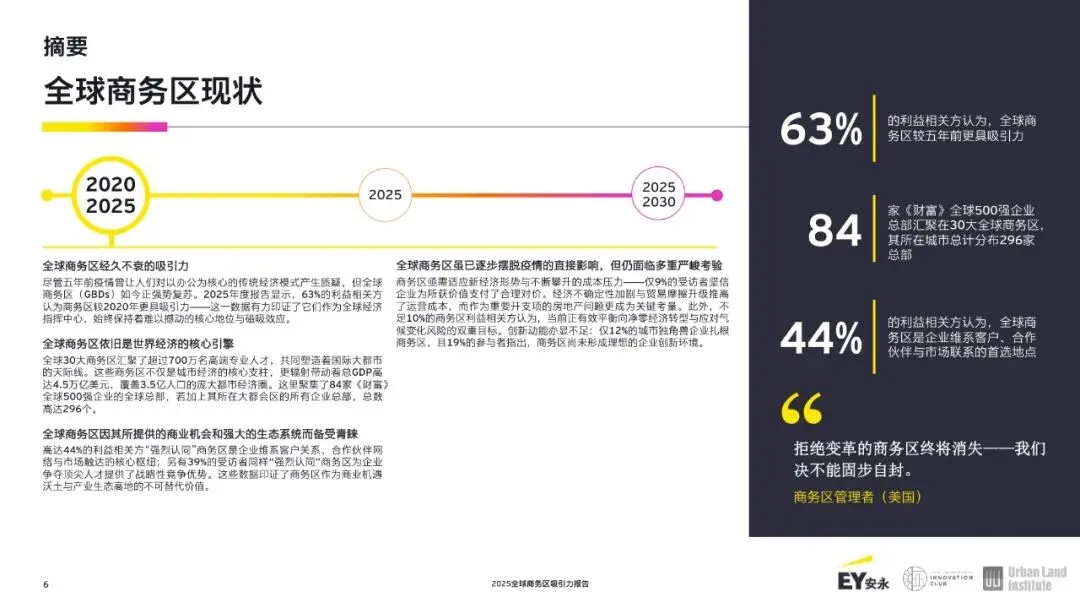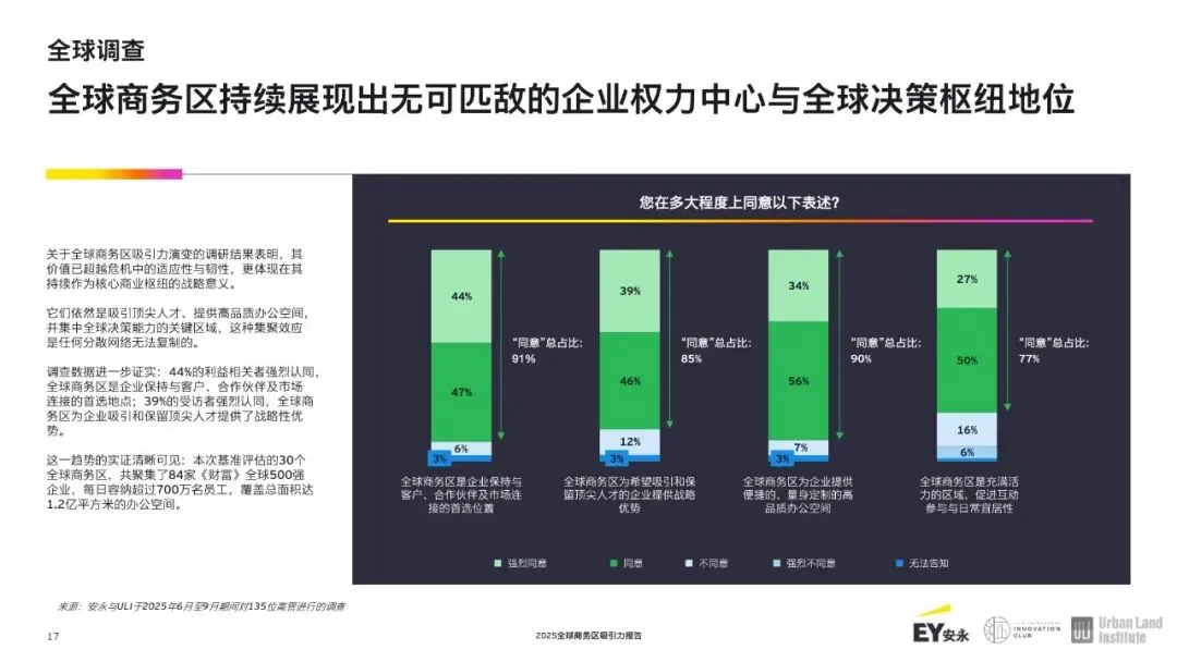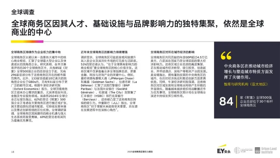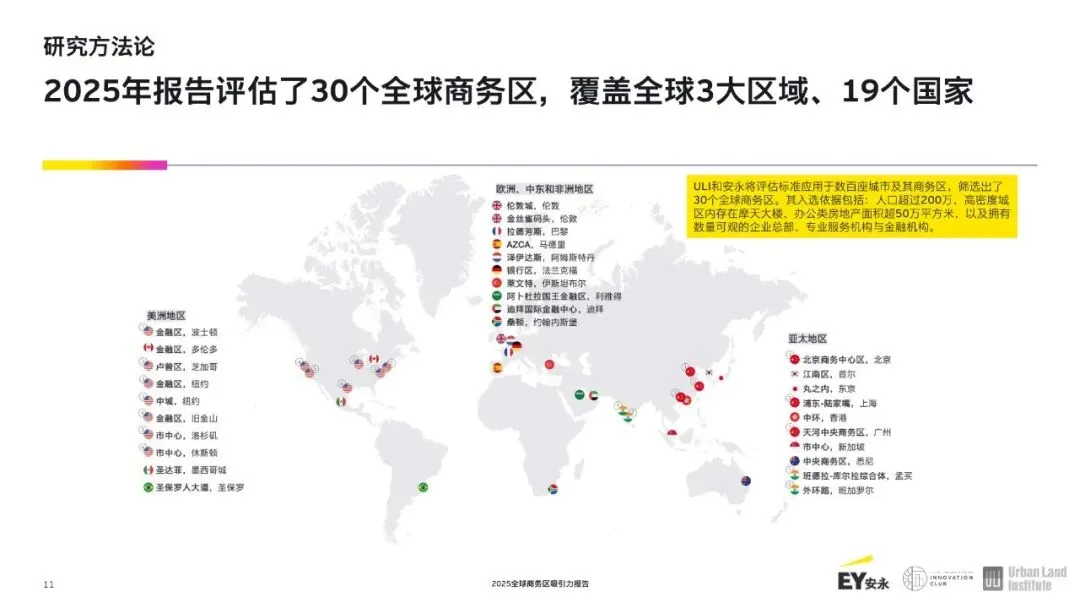 随着经济重心东移,亚洲商务区崛起。全球十大商业区中有四个如今位于亚洲,这反映出该地区经济的快速增长和日益增强的影响力。北京的商务中心区排名第六,得益于熟练的劳动力和强大的住宅区融合;新加坡的市中心核心区域在竞争力方面处于领先地位;上海的浦东-陆家嘴、香港中环、首尔的江南区以及广州的天河商务区已成为全球决策、商业和创新的关键中心。与此同时,悉尼的中央商务区仍是亚太地区的重要枢纽。