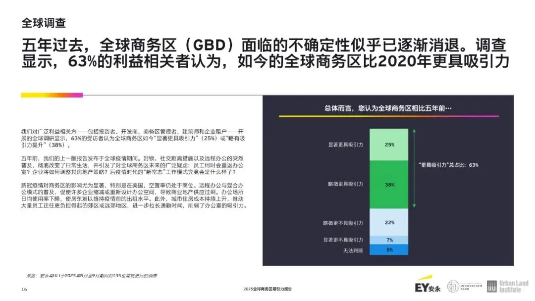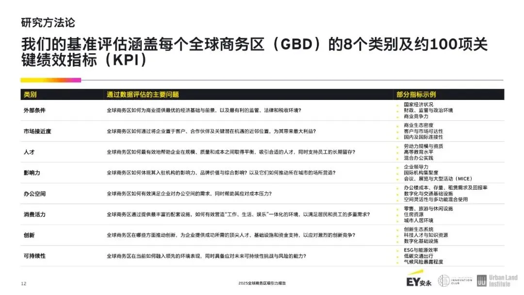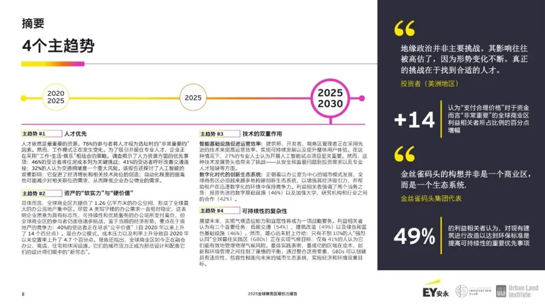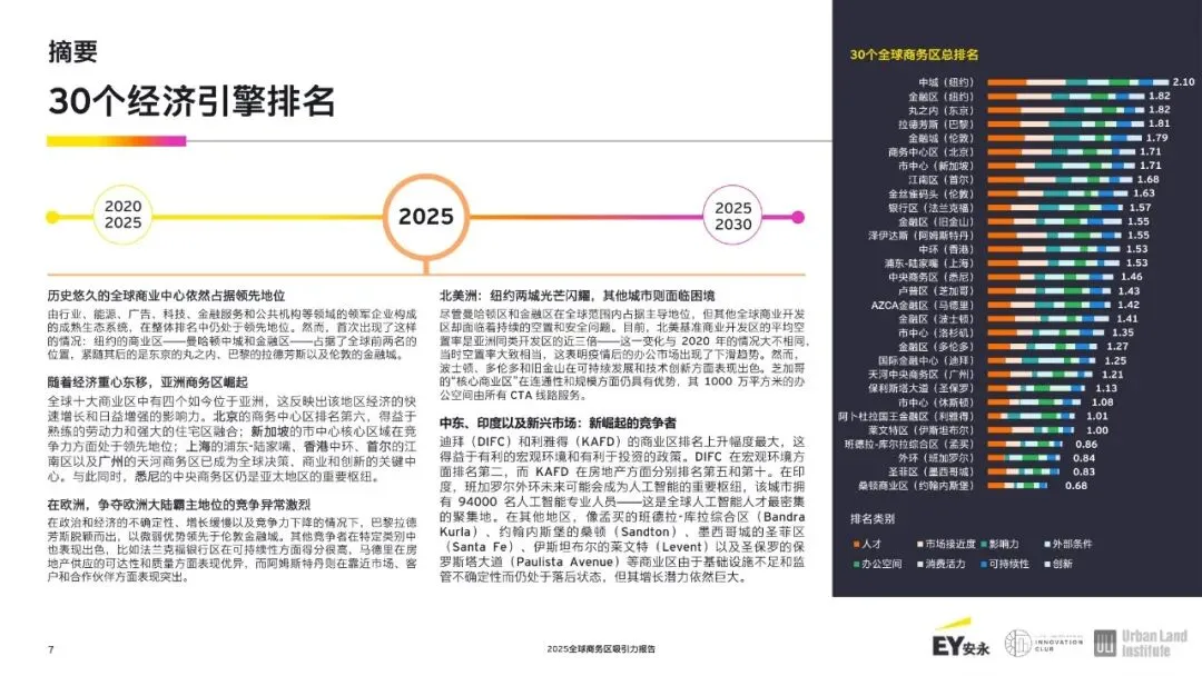 中东、印度以及新兴市场:新崛起的竞争者。迪拜(DIFC)和利雅得(KAFD)的商业区排名上升幅度最大,这得益于有利的宏观环境和有利于投资的政策。DIFC 在宏观环境方面排名第二,而 KAFD 在房地产方面分别排名第五和第十。在印度,班加罗尔外环未来可能会成为人工智能的重要枢纽,该城市拥有 94000 名人工智能专业人员——这是全球人工智能人才最密集的聚集地。在其他地区,像孟买的班德拉-库拉综合区(BandraKurla)、约翰内斯堡的桑顿(Sandton)、墨西哥城的圣菲区(Santa Fe)、伊斯坦布尔的莱文特(Levent)以及圣保罗的保罗斯塔大道(Paulista Avenue)等商业区由于基础设施不足和监管不确定性而仍处于落后状态,但其增长潜力依然巨大。