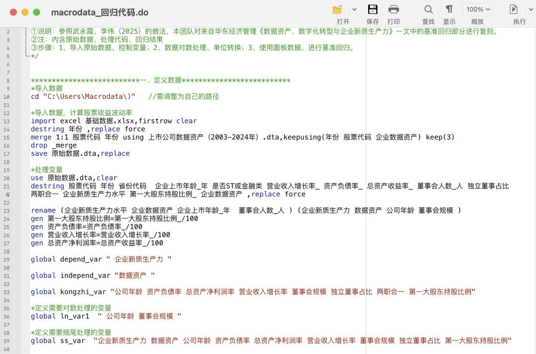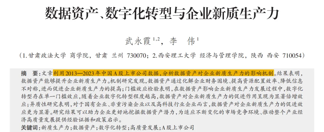 本文基于2013-2023年我国A股上市公司面板数据,围绕武永霞等(2025)在《华东经济管理》发表的《数据资产、数字化转型与企业新质生产力》一文中的基准回归部分开展实证复刻,包括原始数据、基准回归代码