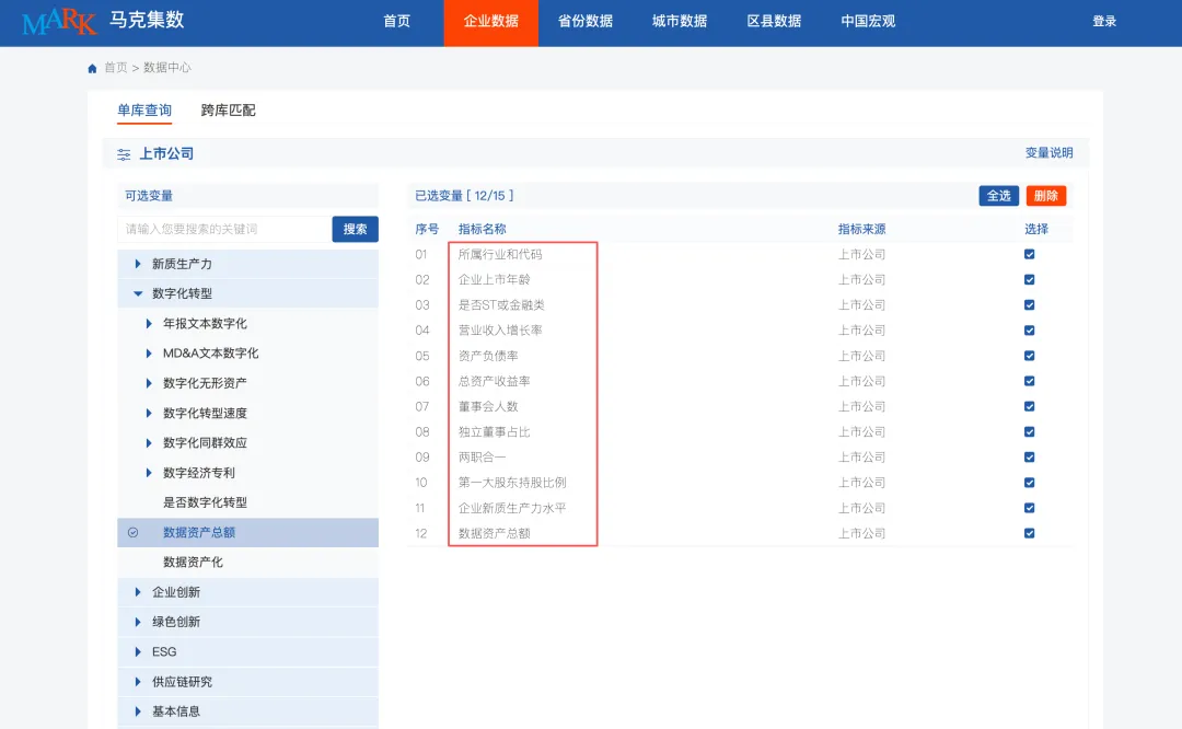 选择原文提到的核心指标、控制变量:企业新质生产力水平、企业数据资产、企业上市年龄、是否ST类或金融类、营业收入增长率、资产负债率、总资产收益率、董事会人数、独立董事占比、两职合一、第一大股东持股比例