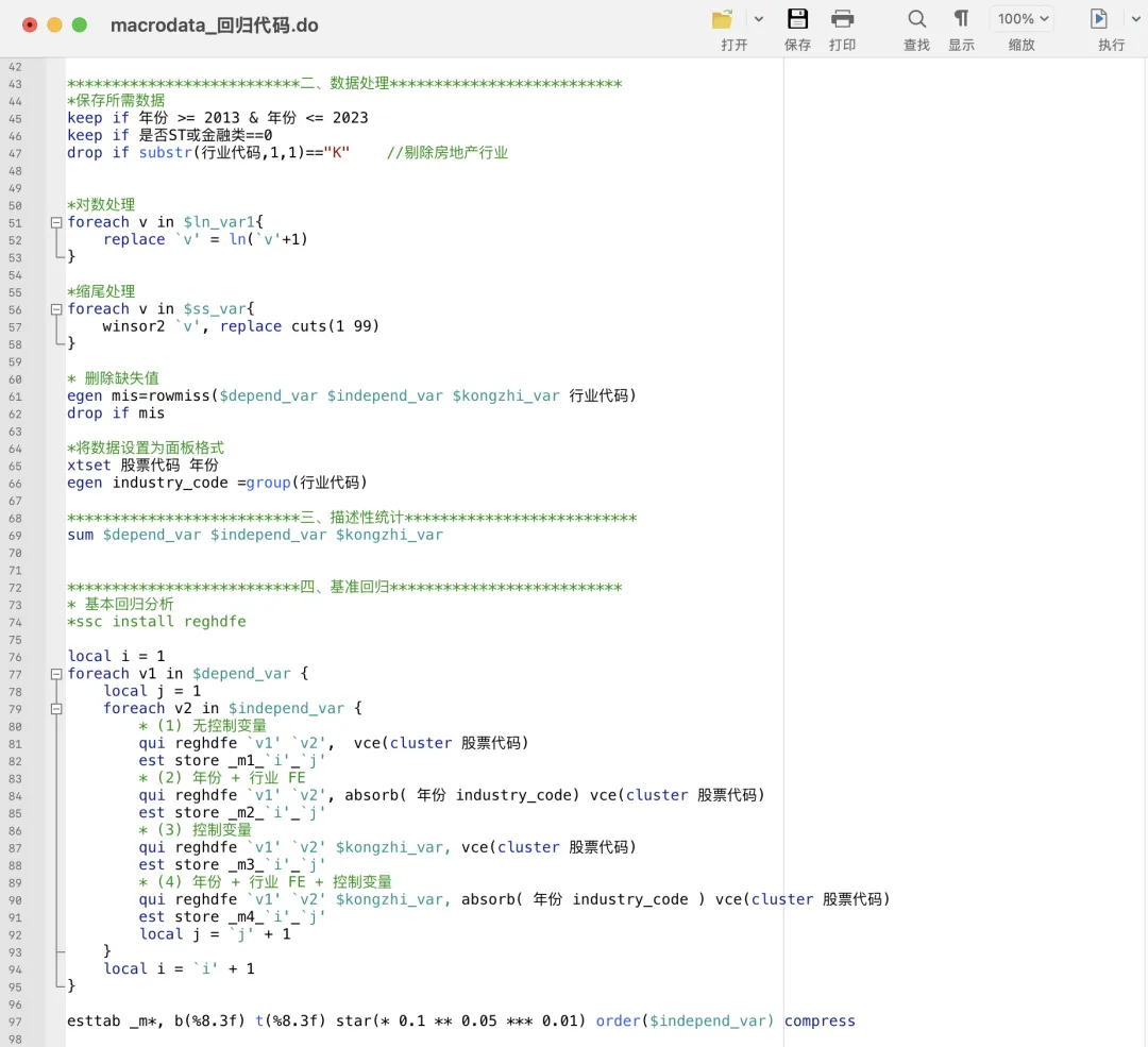 将数据导入Stata,并对数据进行更名、对数化、缩尾等处理,为接下来回归分析做好数据准备