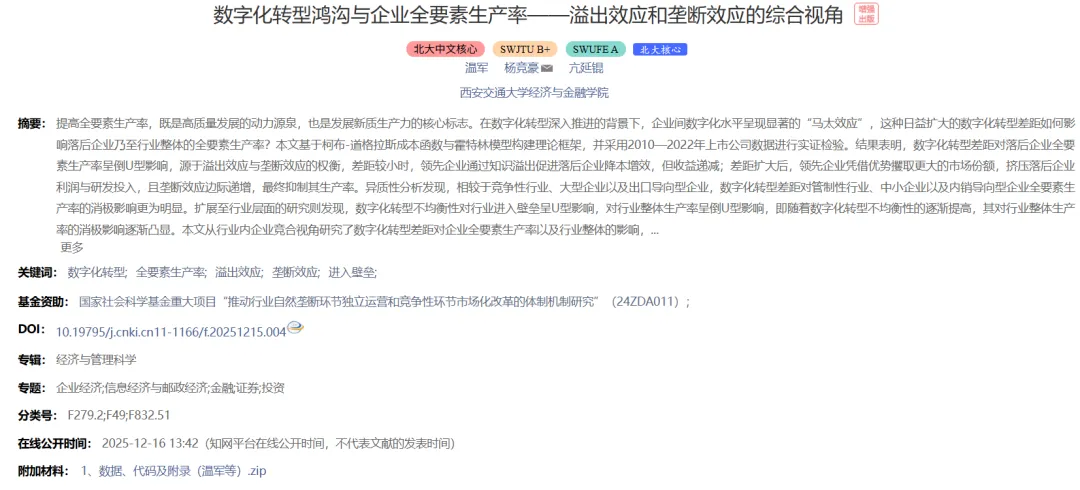 ✒️Title:数字化转型鸿沟与企业全要素生产率——溢出效应和垄断效应的综合视角