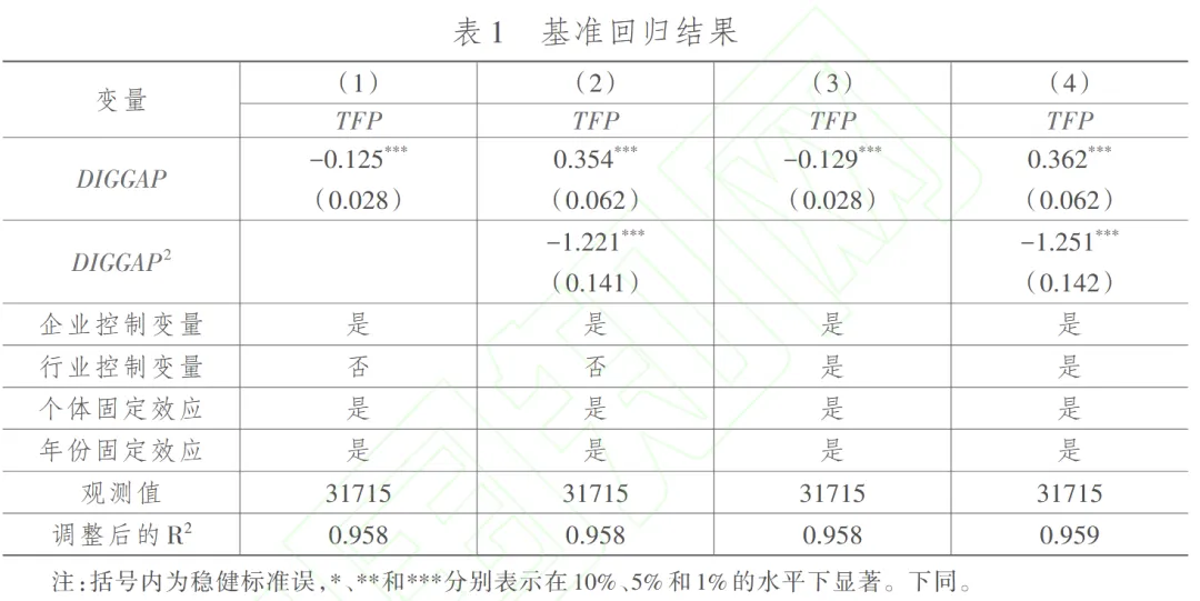 企业数字化转型差距(DIGGAP):采用企业年报中“管理层讨论与分析” (MD&A) 部分与数字化相关的词语出现的频次占比来度量企业的数字化转型程度 (DIG) 。为了表述方便,我们将该指标乘以10, DIG数值越大,表示企业数字化转型程度越高。定义数字化转型领先企业为当年行业内数字化转型程度处于前10%的企业,将这些企业的数字化转型程度取均值,作为该行业当年的数字化转型领先水平,然后将其余企业当年数字化转型程度与之作差并取绝对值,从而得到“企业- 年”层面的数字化转型差距变量。