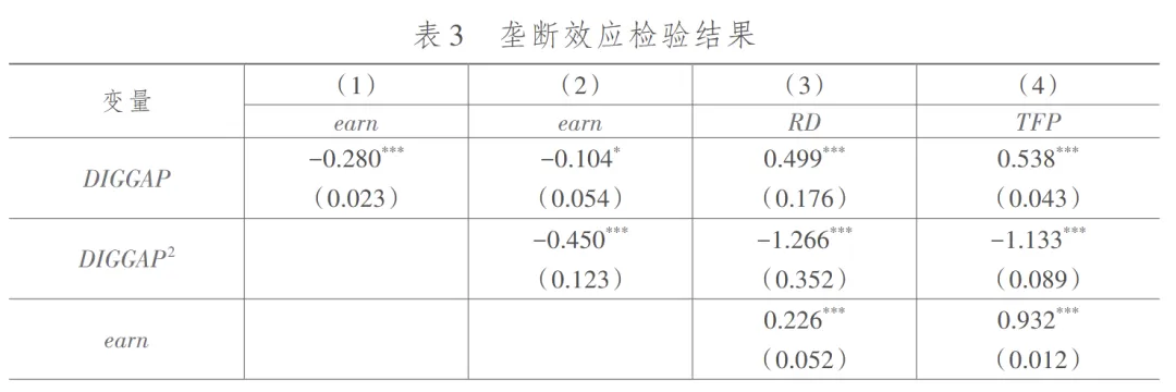 对专利引用次数加 1 取对数,构造溢出变量 垄断效应:采用链式中介效应模型检验“数字化转型差距过大— 企业利润下滑— 企业创新投入减少— 全要素生产率下降”这一逻辑链条
