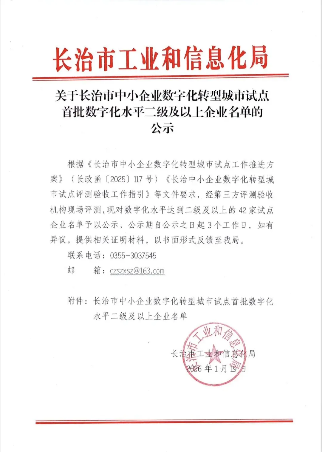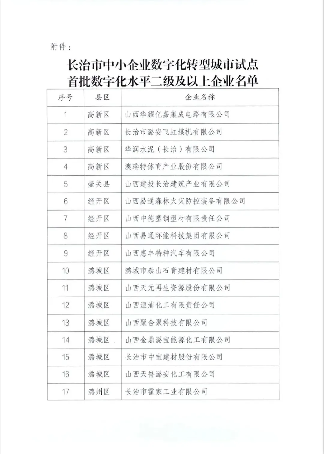 关于长治市中小企业数字化转型城市试点首批数字化水平二级及以上企业名单的公示