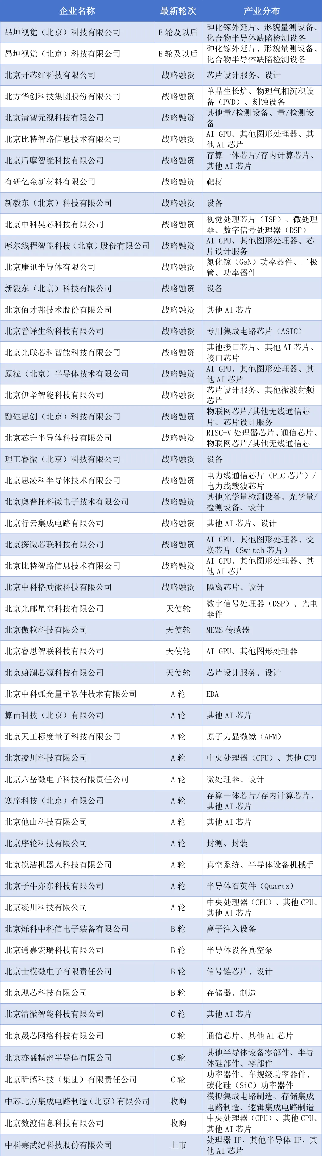 京津冀地区(以北京为主)聚焦高端算力芯片赛道,沐曦集成专注于高性能通用 GPU 芯片研发,北京忆芯科技聚焦企业级 SSD 控制器芯片与存储解决方案,客户覆盖云计算、数据中心等领域,企业清单展示如下: