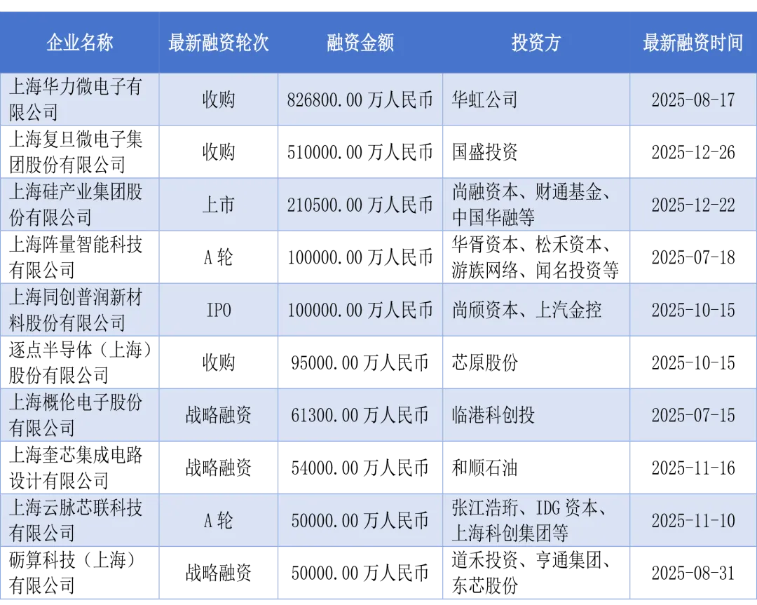 长三角地区(以上海为主)企业覆盖存储、算力核心赛道,资本认可度极高。摩尔线程作为国产GPU标杆,上市首日涨幅超500%,市场关注度拉满;中芯集成承接国内 AI 芯片、汽车电子芯片制造,致力于缓解国内先进制程产能缺口,上海市TOP10融资企业清单展示如下: