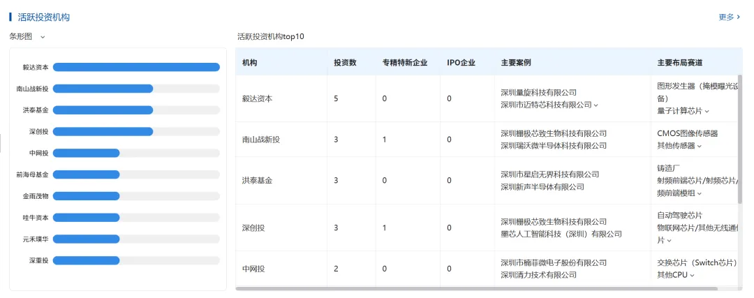 粤港澳大湾区(以深圳为核心)的融资活力高度依赖头部投资机构的精准布局,深圳10大活跃投资机构,聚焦特色芯片、先进材料、封装测试三大核心赛道,推动技术落地与产业链协同,典型布局如下: 深创投与深重投重点投向芯片设计、先进封装及关键零部件领域,助力龙头企业突破先进制程装备瓶颈,同时孵化细分赛道高潜质团队。深重投依托产业资源,推动基金向通用算力芯片、新型存储等领域倾斜,导入生态圈资源为企业提供应用场景支撑,强化“耐心资本+产业赋能”优势。此外,深圳先进制造业供应链创新服务平台与赛米基金形成协同,为企业提供跨境金融、资源集采等服务,推动区域半导体产业升级,进一步巩固“应用牵引、生态协同”的区域特色。
