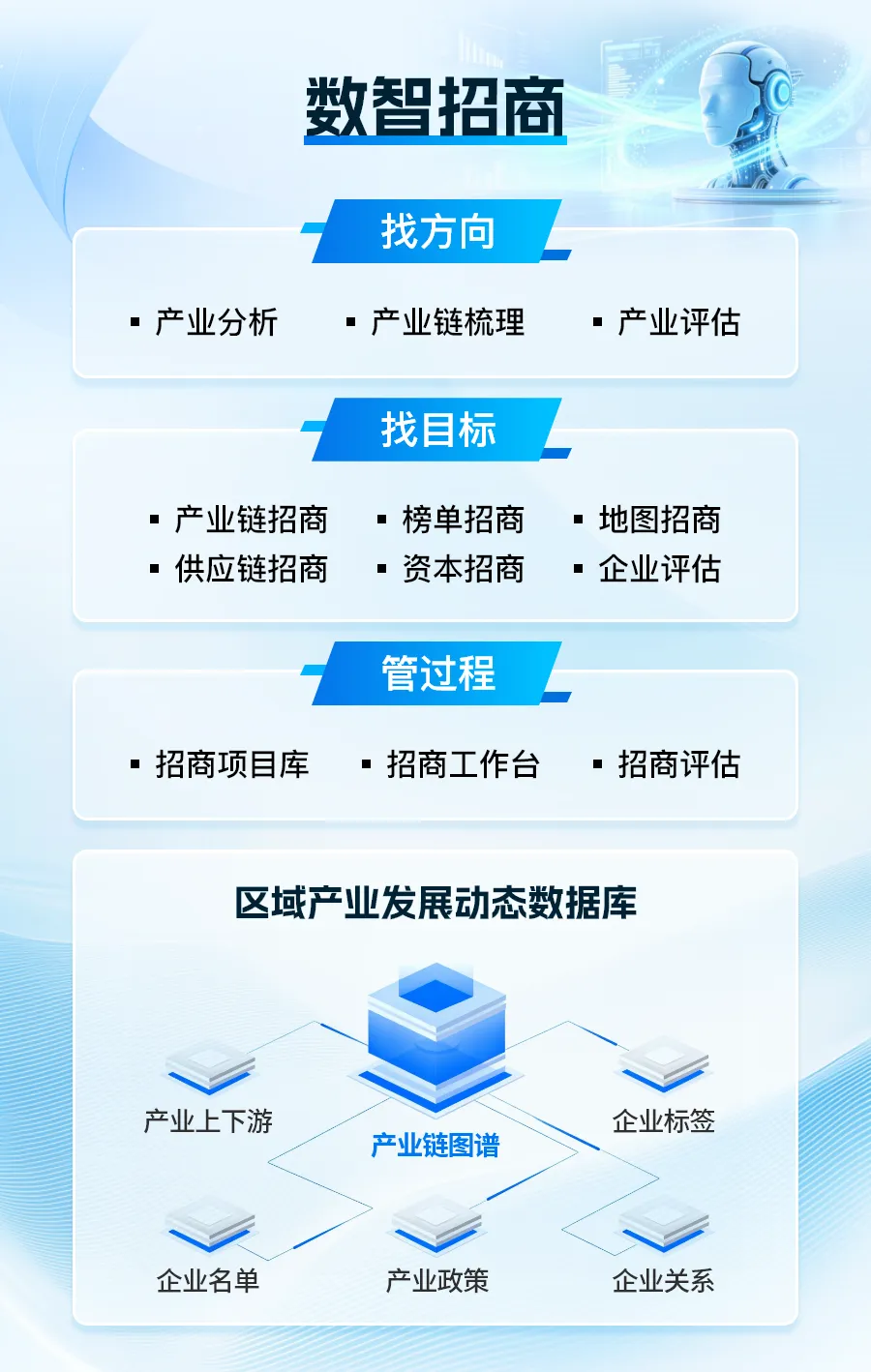 聚焦产业转型场景:凭借“多元数据资源+多引擎多模型技术+成熟产品矩阵”的综合优势,为不同主体提供一站式数智招商解决方案,输出专业产业数据分析报告、行业趋势研判成果;绘制产业图谱及关联节点;分享产业转型研究成果。