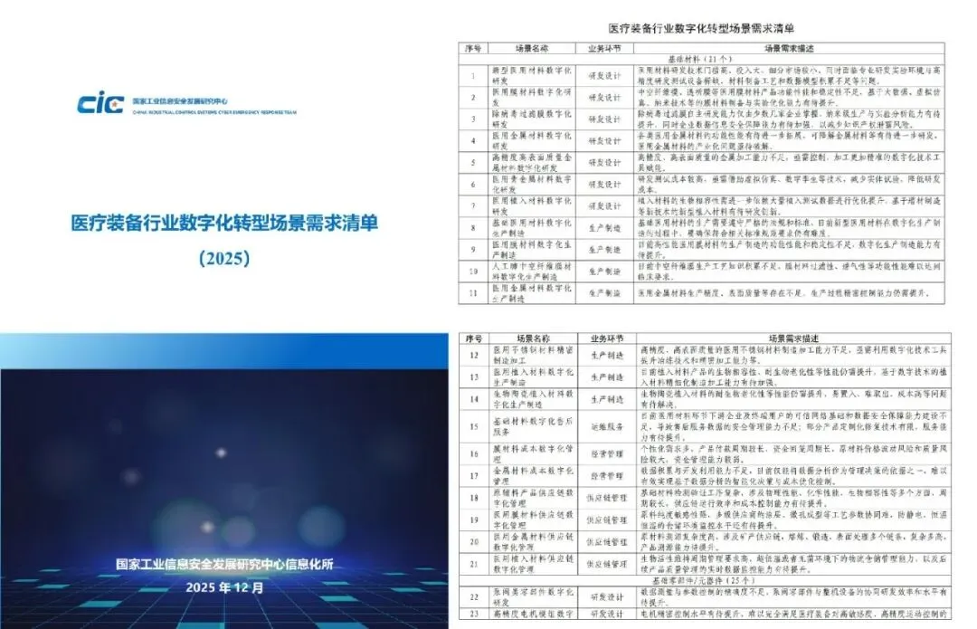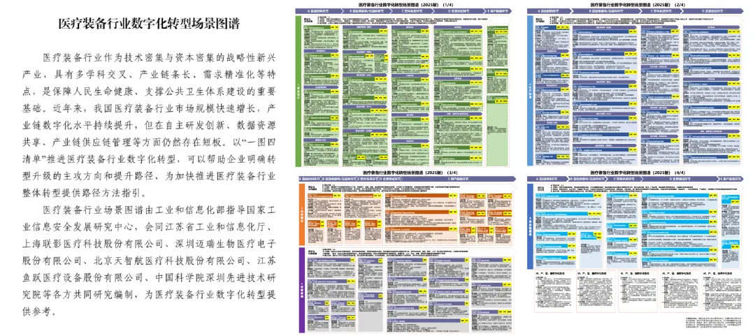 2025年12月9日,在辽宁沈阳召开的2025年两化融合暨数字化转型大会“医疗装备及器械行业数字化转型供需对接专题活动”上,由国家工业信息安全发展研究中心编制的《医疗装备行业数字化转型场景图谱》《医疗装备行业数字化转型场景需求清单》《医疗装备及器械行业数字化转型发展报告(2025)》三项核心成果重磅发布。