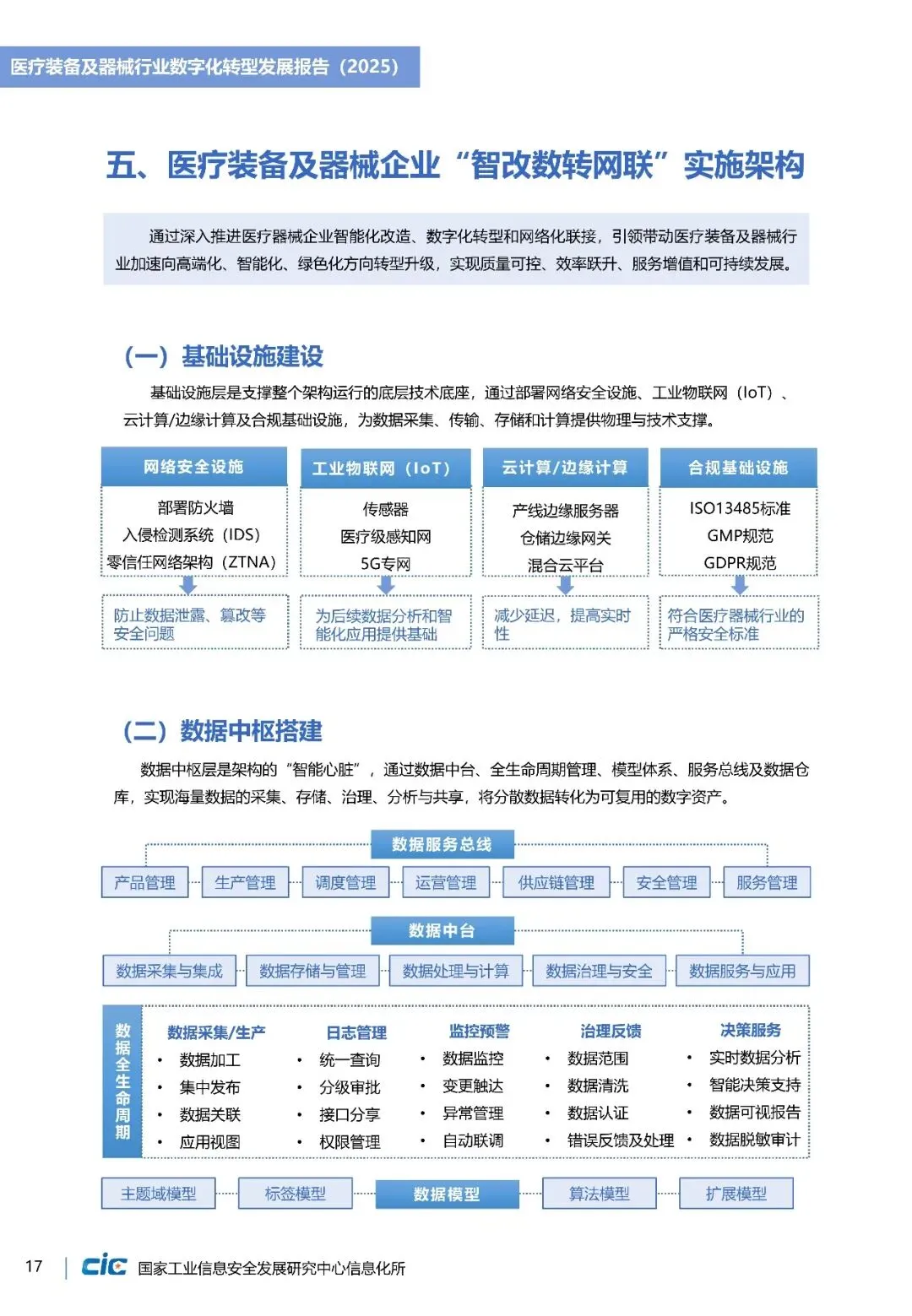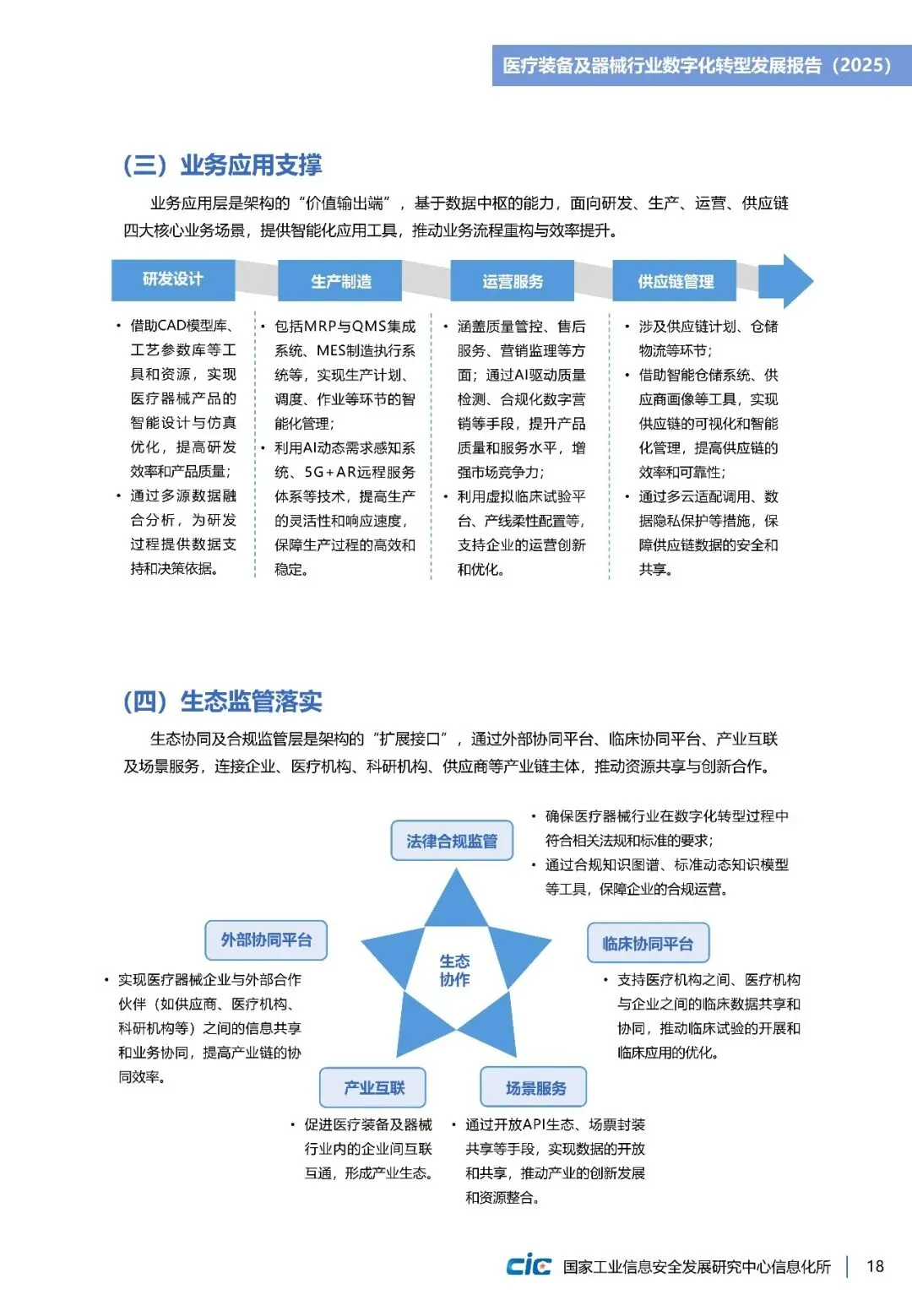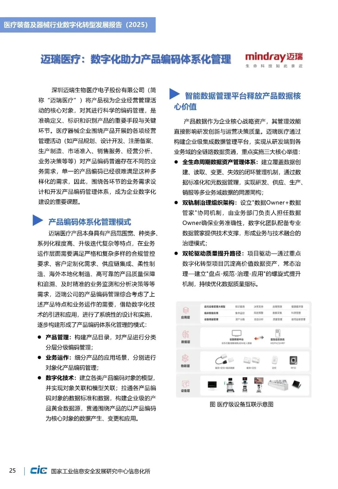 《医疗装备及器械行业数字化转型发展报告(2025)》立足全球视野,梳理美国、欧盟等在产品创新、质量管理等方面实践路径。并结合我国长三角、珠三角等重点产业集群数字化转型实践,提出涵盖基础设施建设、数据中枢搭建、业务应用支撑、生态监管落四个层级的“智改数转”实施架构,为企业数字化转型提供详细“作业指导”。