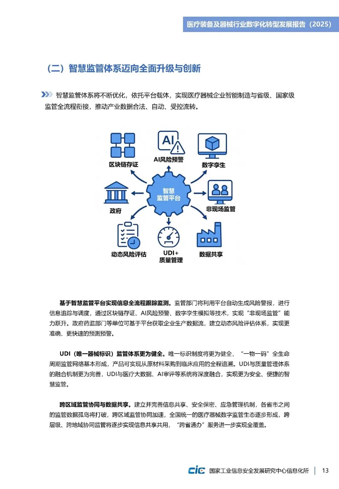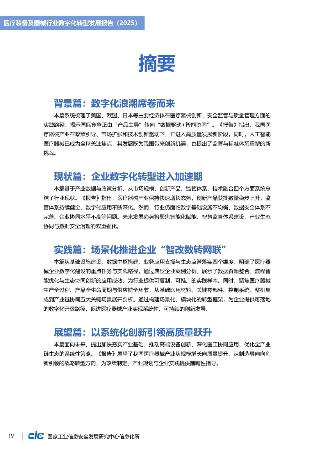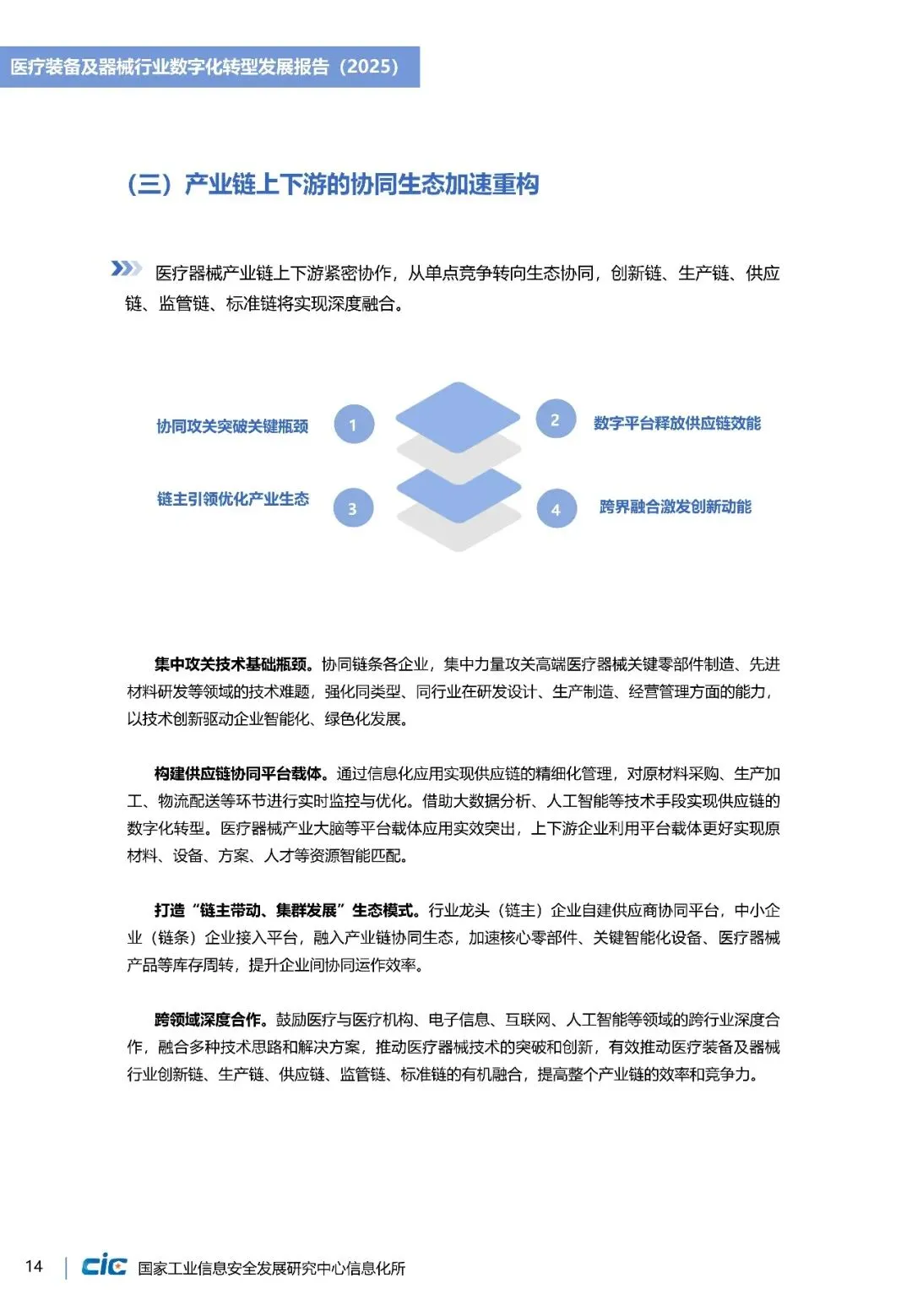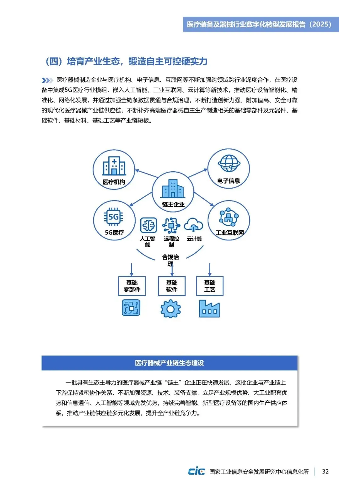 《医疗装备及器械行业数字化转型发展报告(2025)》立足全球视野,梳理美国、欧盟等在产品创新、质量管理等方面实践路径。并结合我国长三角、珠三角等重点产业集群数字化转型实践,提出涵盖基础设施建设、数据中枢搭建、业务应用支撑、生态监管落四个层级的“智改数转”实施架构,为企业数字化转型提供详细“作业指导”。