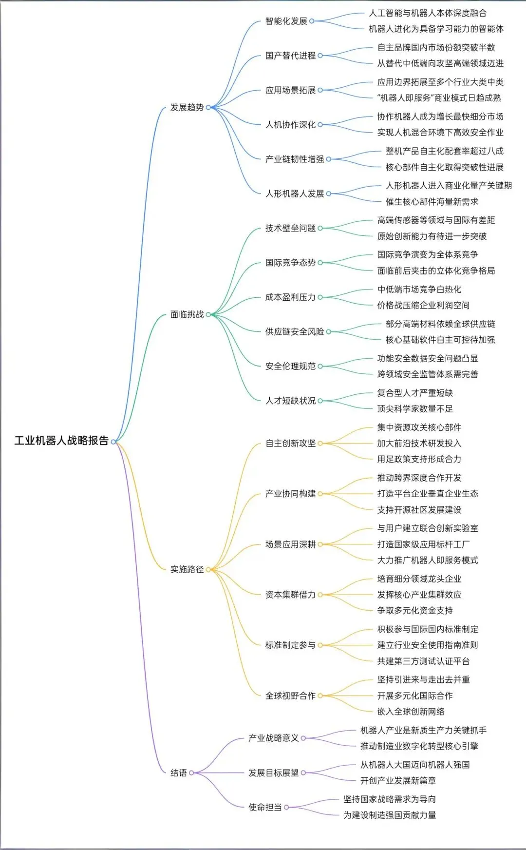本报告旨在立足国家“高端、智能、绿色、融合、安全”的整体发展要求,结合我国拥有超大规模市场和80个国家级先进制造业集群的独特优势,深入剖析产业趋势,直面内外部挑战,并系统规划公司乃至产业层面的实施路径,以期在迈向机器人强国的征程中,把握主动,赢得未来。